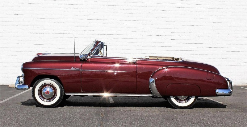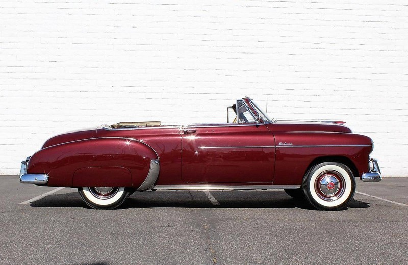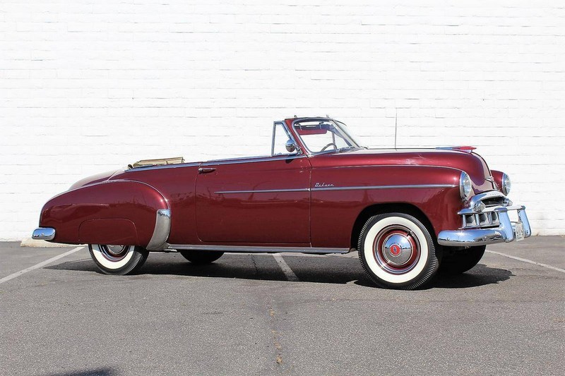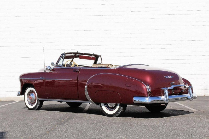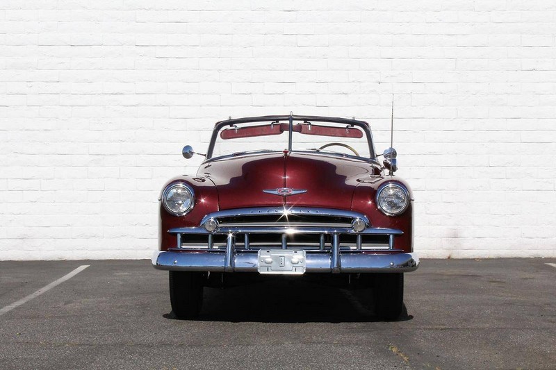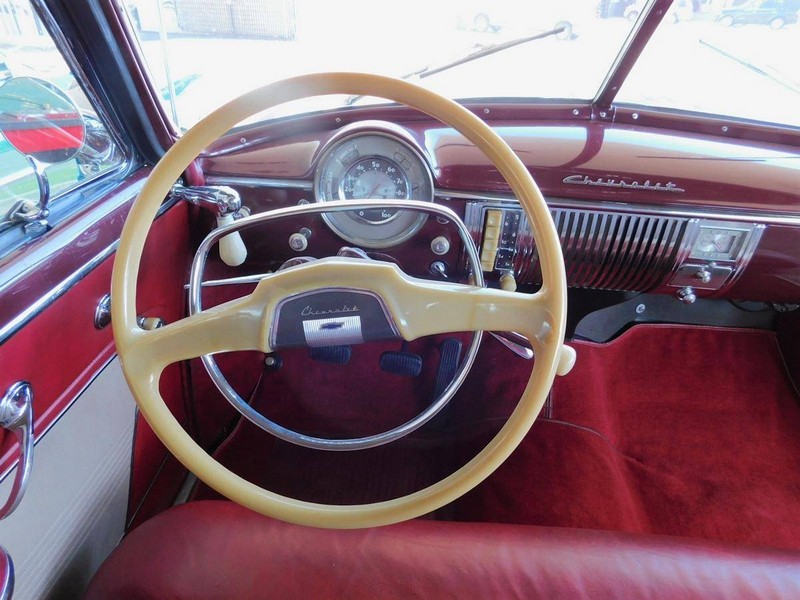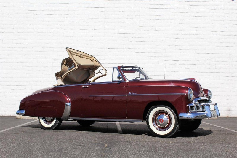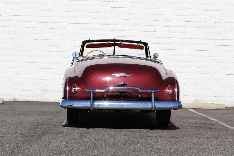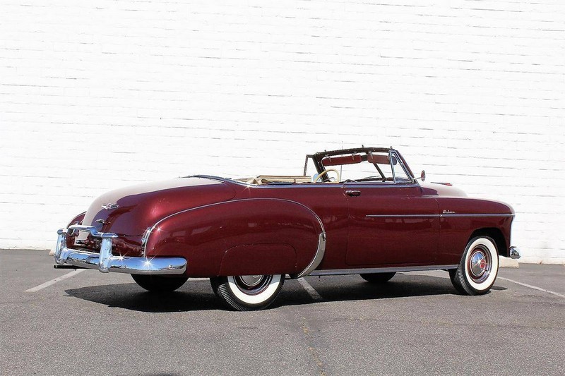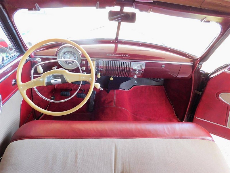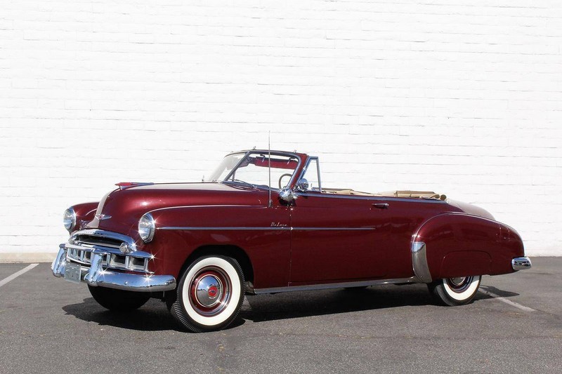 1949 Chevrolet Deluxe Convertible. 52,510 miles – 3-speed manual transmission. The car is finished in Regal Maroon and is fitted with a power-operated beige soft top, matching fender skirts and a chrome driver’s-side spotlight. Chrome accents are present and include a Deluxe hood ornament with a red insert, stone guards and rocker-panel moldings, front and rear bumper guards with extensions, trim rings and Bowtie center caps. The two-tone red-vinyl and beige-cloth interior is in great condition along with the matching carpets and door panels. Interior options include a contrasting beige steering wheel, cigar lighter and ashtray, radio, clock and heater. The engine compartment is fairly clean and houses a 216 CI inline 6-cylinder engine mated to a 3-speed manual transmission with a column-mounted shifter.