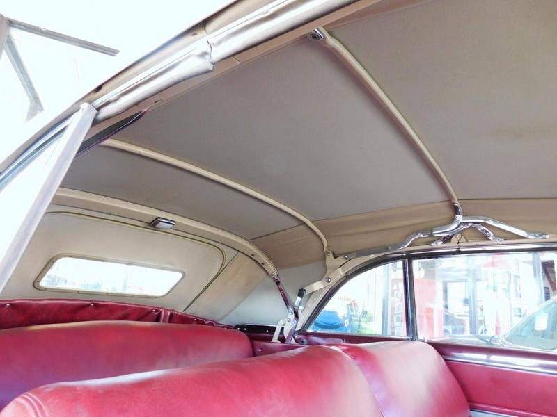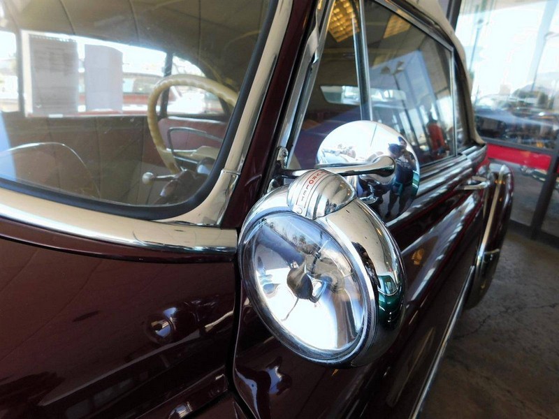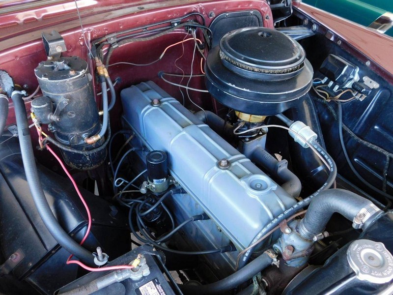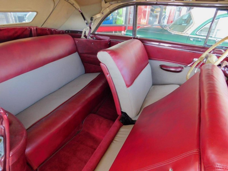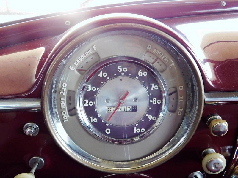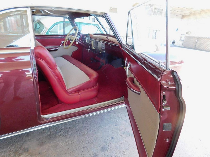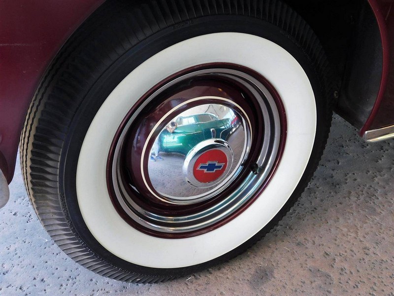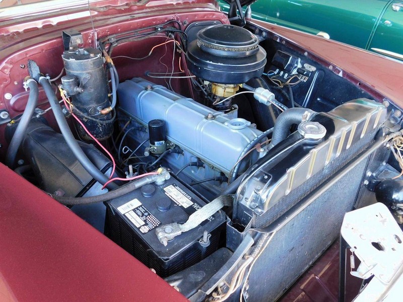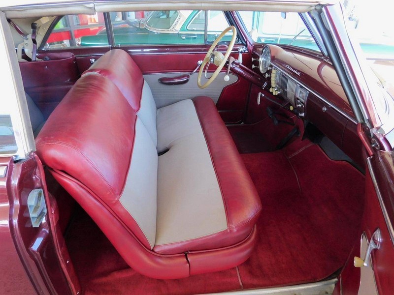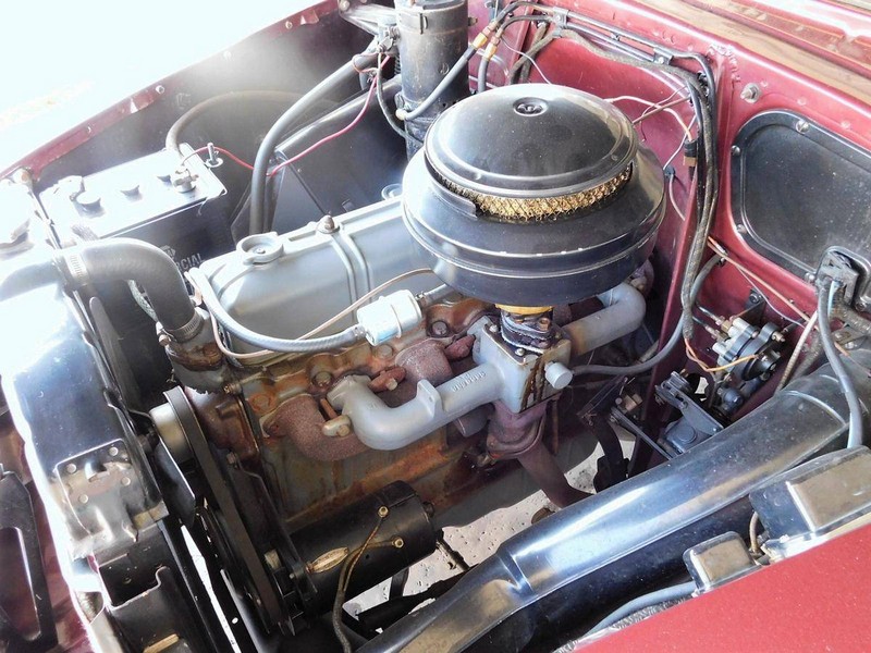 1949 Chevrolet Deluxe Convertible. 52,510 miles – 3-speed manual transmission. The car is finished in Regal Maroon and is fitted with a power-operated beige soft top, matching fender skirts and a chrome driver’s-side spotlight. Chrome accents are present and include a Deluxe hood ornament with a red insert, stone guards and rocker-panel moldings, front and rear bumper guards with extensions, trim rings and Bowtie center caps. The two-tone red-vinyl and beige-cloth interior is in great condition along with the matching carpets and door panels. Interior options include a contrasting beige steering wheel, cigar lighter and ashtray, radio, clock and heater. The engine compartment is fairly clean and houses a 216 CI inline 6-cylinder engine mated to a 3-speed manual transmission with a column-mounted shifter.