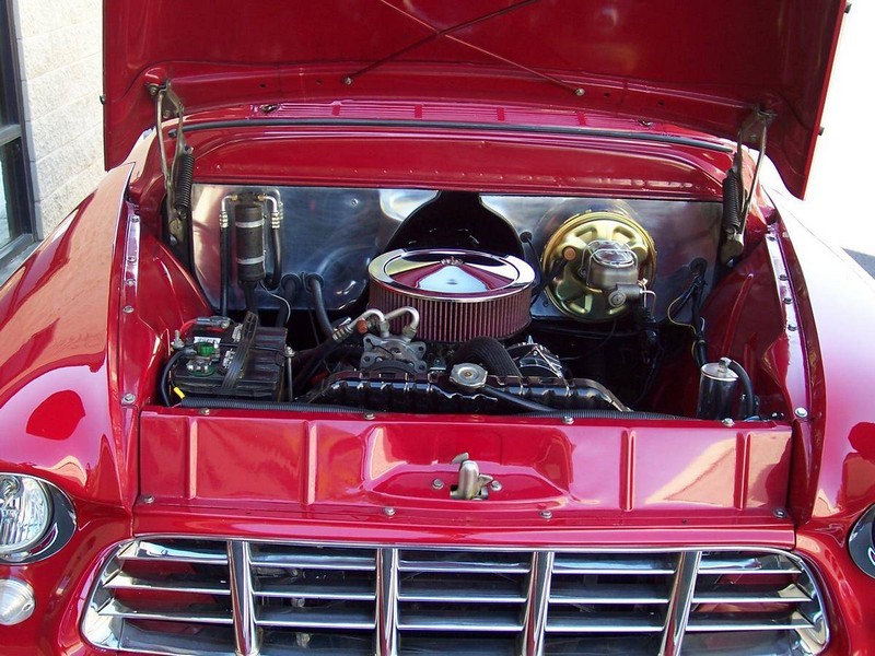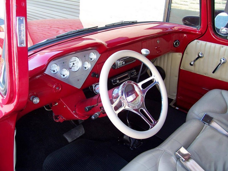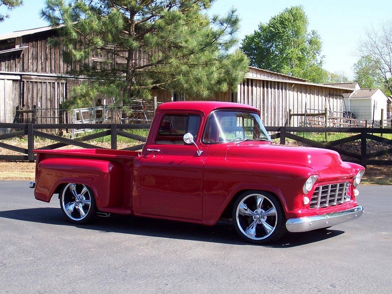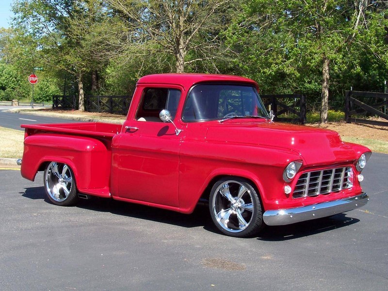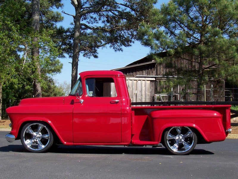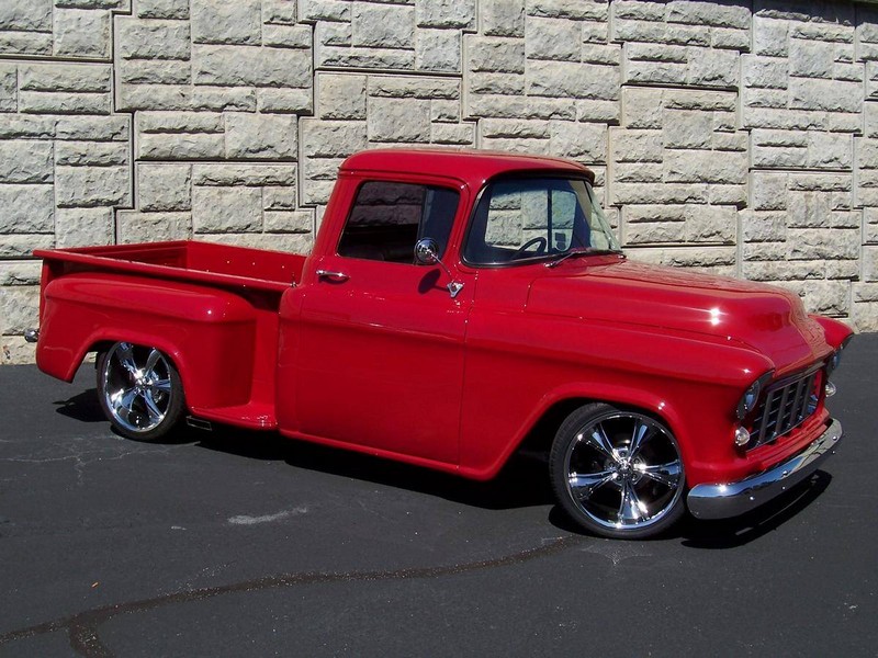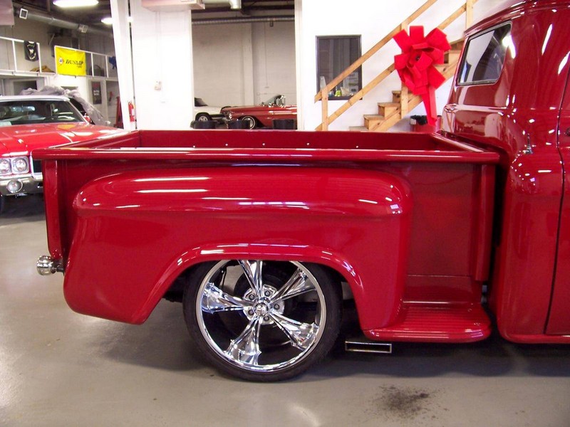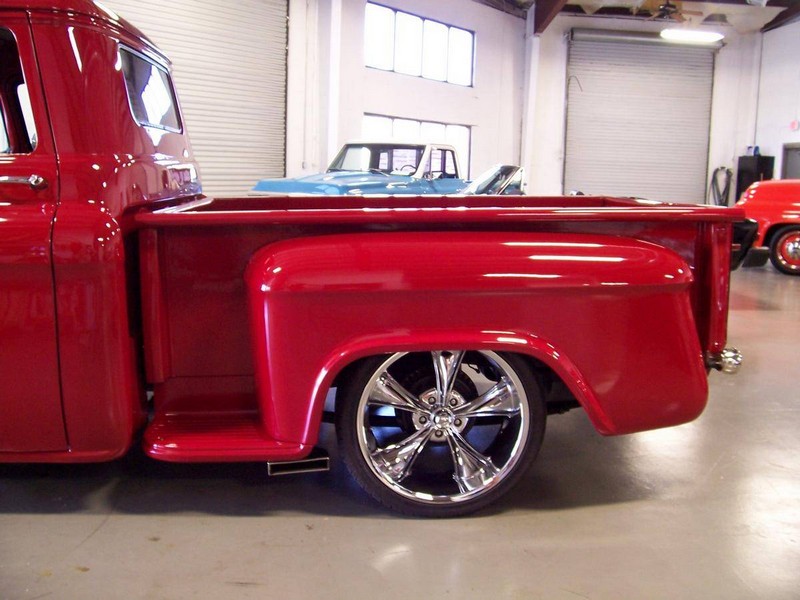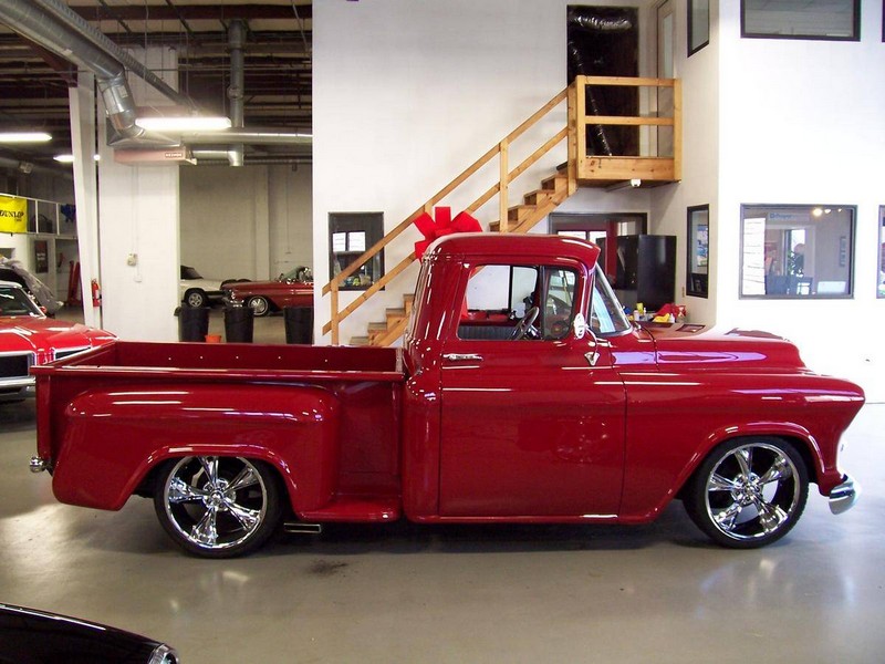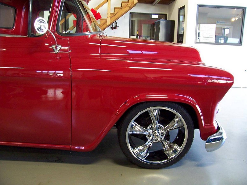 1955 Chevrolet 3100 Short Bed. Under the hood is a nicely built 350 V8 with a slight cam, Edelbrock polished intake, Edelbrock 4bbl carburetor, headers, breathing out the throaty dual exhaust that exits out the side under the side steps in the bed. Horsepower is estimated at 300 hp and it is believed that there are 29,450 on the motor and drivetrain since the restoration. Engine bay is nicely detailed with smoothed firewall finished in stainless panels. Smooth shifting 700R4 automatic/overdrive transmission with a Lokar shifter. Nova front clip with power steering and power front disc brakes makes handling and stopping this Hot Rod a breeze. Front stabilizer bar and nicely lowered for an awesome stance. Sitting on a like new set of 20″ Riddler wheels wrapped in brand new 235/35/20 tires up front and rears with plenty of tread. Highway friendly gearing in the 12 bolt rear end. Undercarriage looks great with no rust issues. This is a really fun truck to drive and it sounds fantastic.