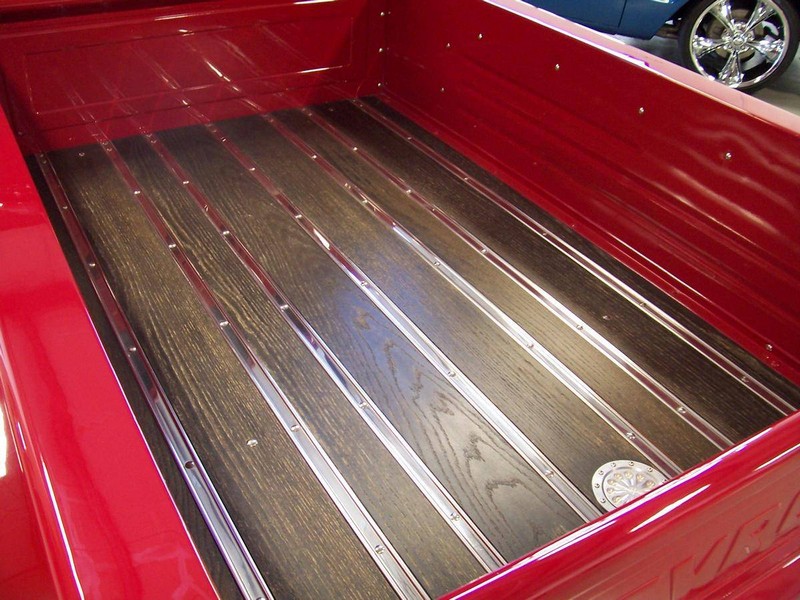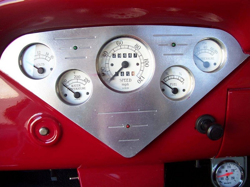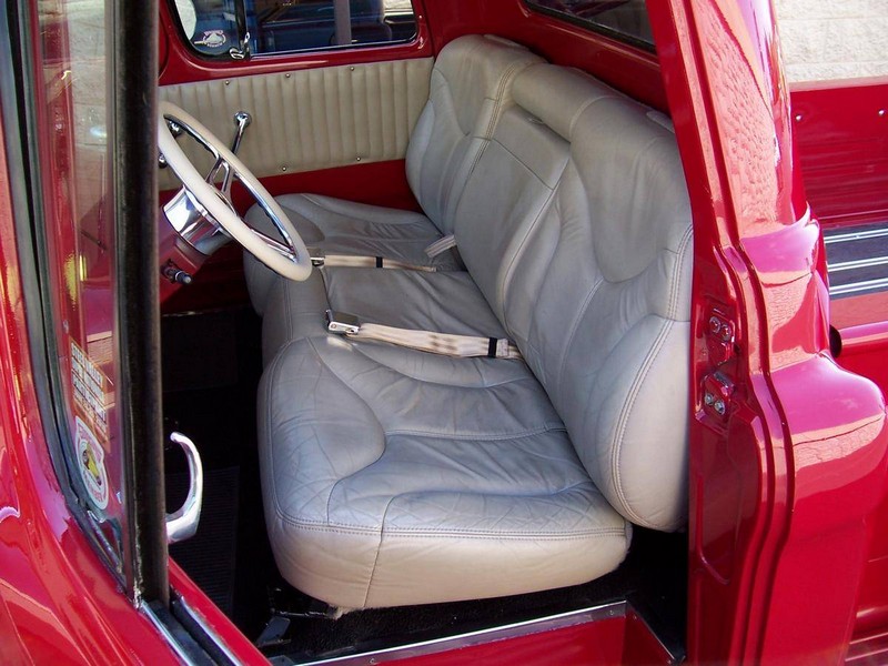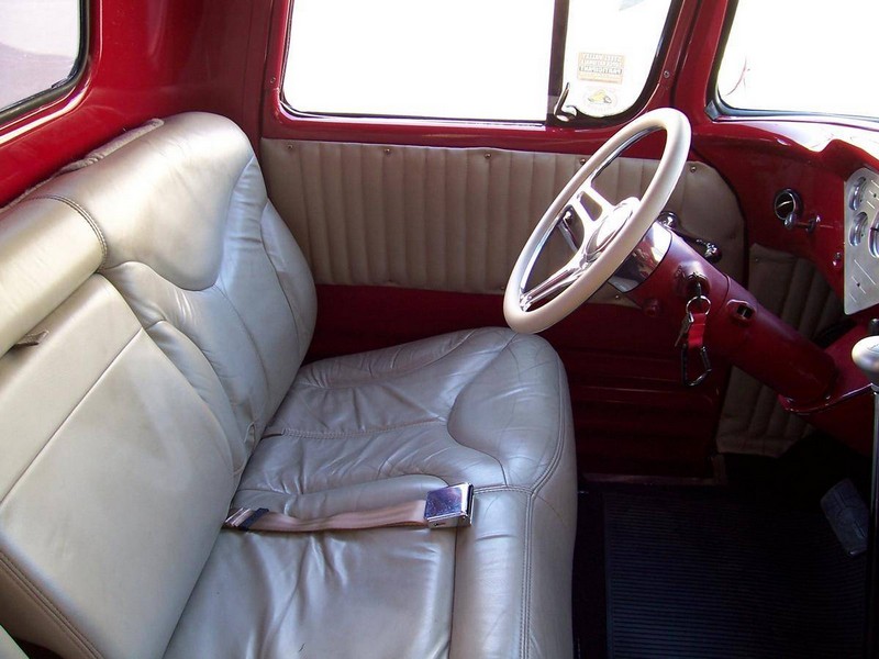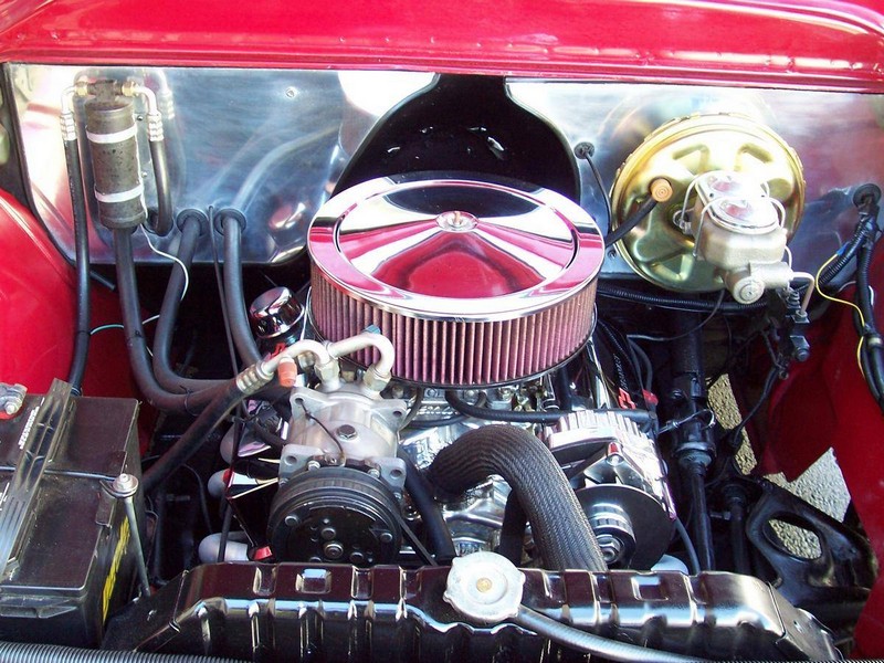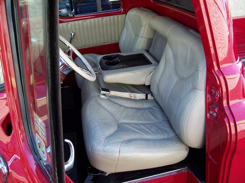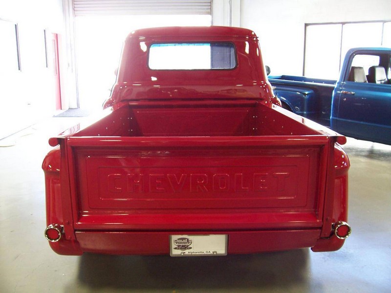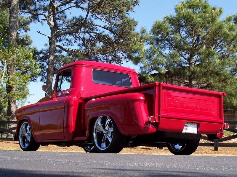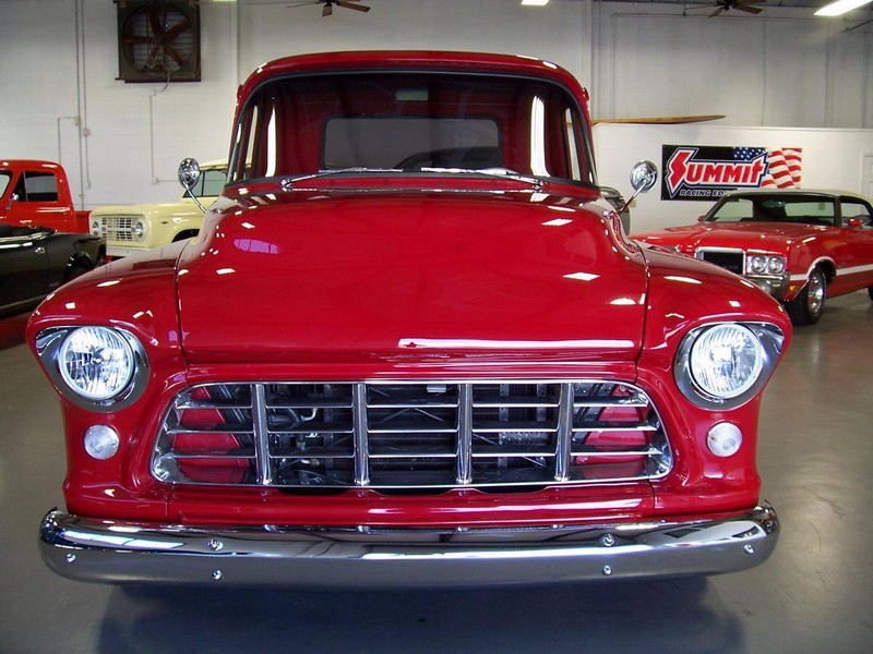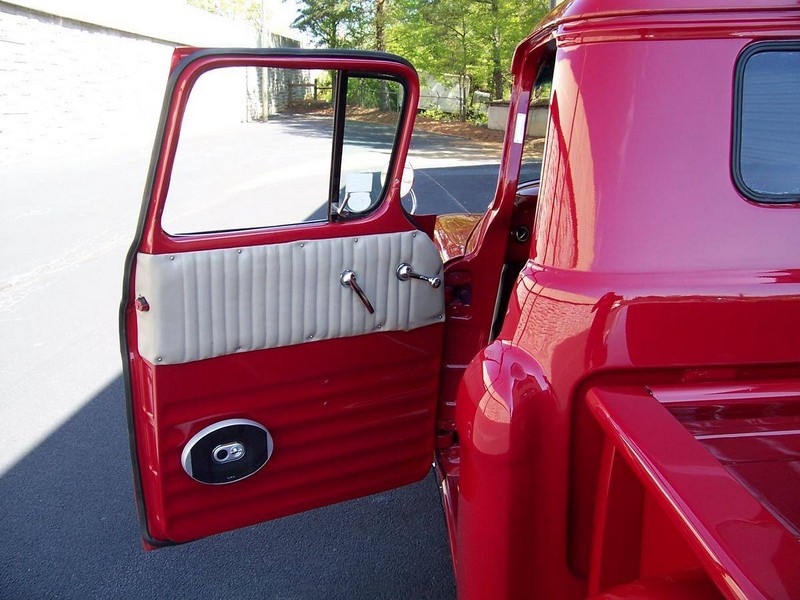 1955 Chevrolet 3100 Short Bed. Under the hood is a nicely built 350 V8 with a slight cam, Edelbrock polished intake, Edelbrock 4bbl carburetor, headers, breathing out the throaty dual exhaust that exits out the side under the side steps in the bed. Horsepower is estimated at 300 hp and it is believed that there are 29,450 on the motor and drivetrain since the restoration. Engine bay is nicely detailed with smoothed firewall finished in stainless panels. Smooth shifting 700R4 automatic/overdrive transmission with a Lokar shifter. Nova front clip with power steering and power front disc brakes makes handling and stopping this Hot Rod a breeze. Front stabilizer bar and nicely lowered for an awesome stance. Sitting on a like new set of 20″ Riddler wheels wrapped in brand new 235/35/20 tires up front and rears with plenty of tread. Highway friendly gearing in the 12 bolt rear end. Undercarriage looks great with no rust issues. This is a really fun truck to drive and it sounds fantastic.
