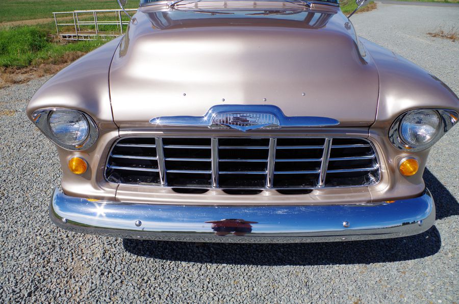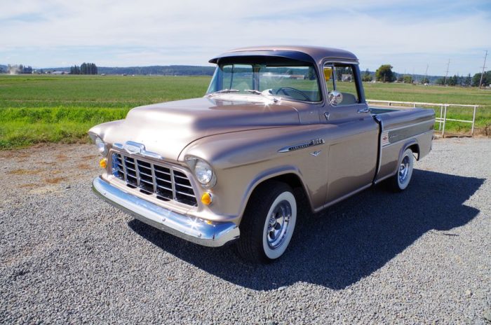 This has to be the nicest, most beautiful and well maintained 1956 Chevy Cameo in the state of Washington (and yes, that’s a ’57 bed). Powered by a fine running 283 sitting under the hood, a 3 speed on the column and dual exhaust that finish off the drive train package. New front disc brakes installed. Refurbed and repainted steering gear box installed. Rear main seal replaced. New B. F. Goodrich rubber and Ultra mags make up the stunning wheels. Paint and chrome really shine. Visor, posts and bed sport a beautiful deep green and offsets the sultry Frosted Mocha body. Standard issue interior for the 1950’s with beautiful white leather upholstery and vinyl floors.