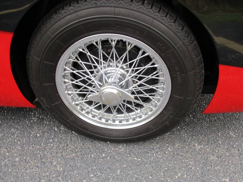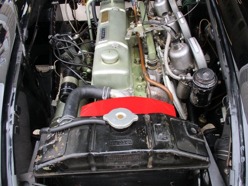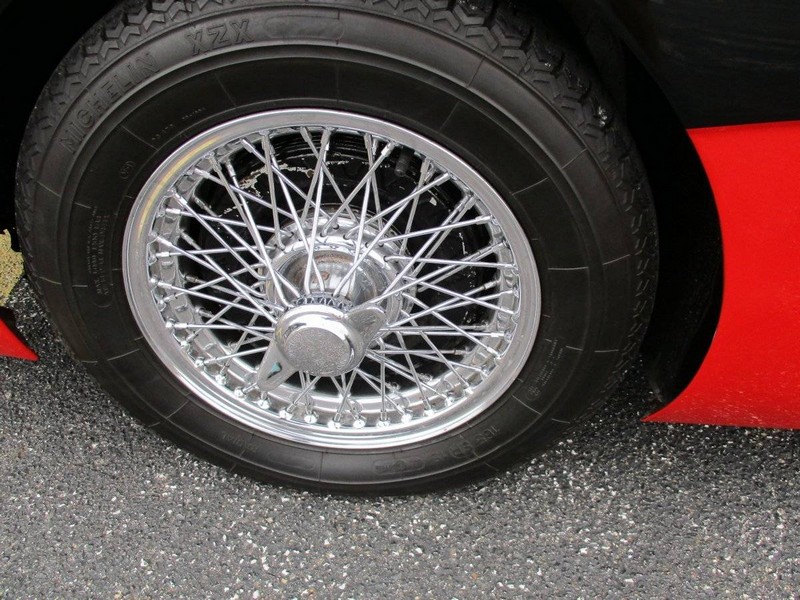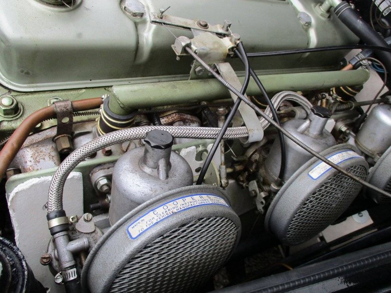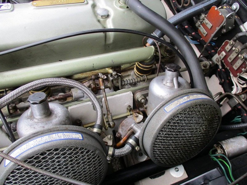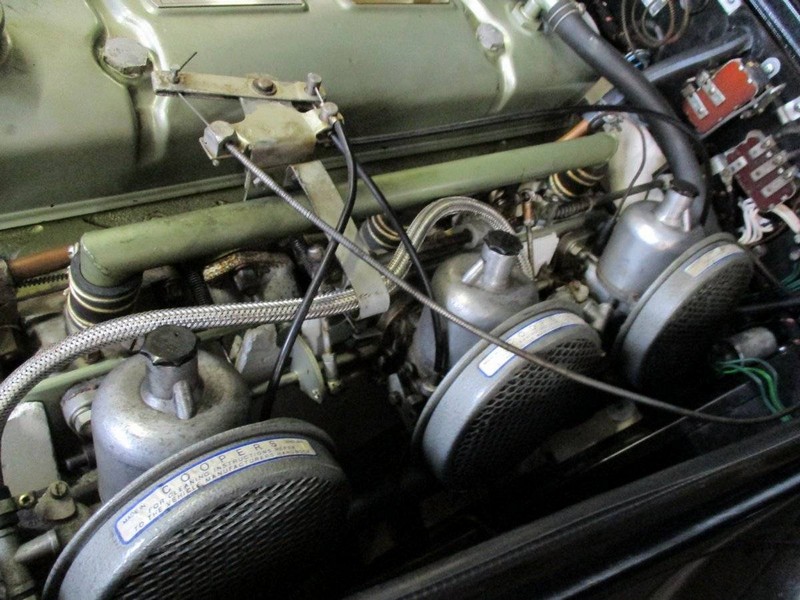 This car sports triple SU HS4 carburetors, a folding roof, chrome wire wheels, heater, a laminated windscreen, and two-tone paint. It also has a tonneau that covers both front and rear seats. Car comes with convertible top and set of side curtains.