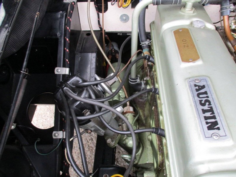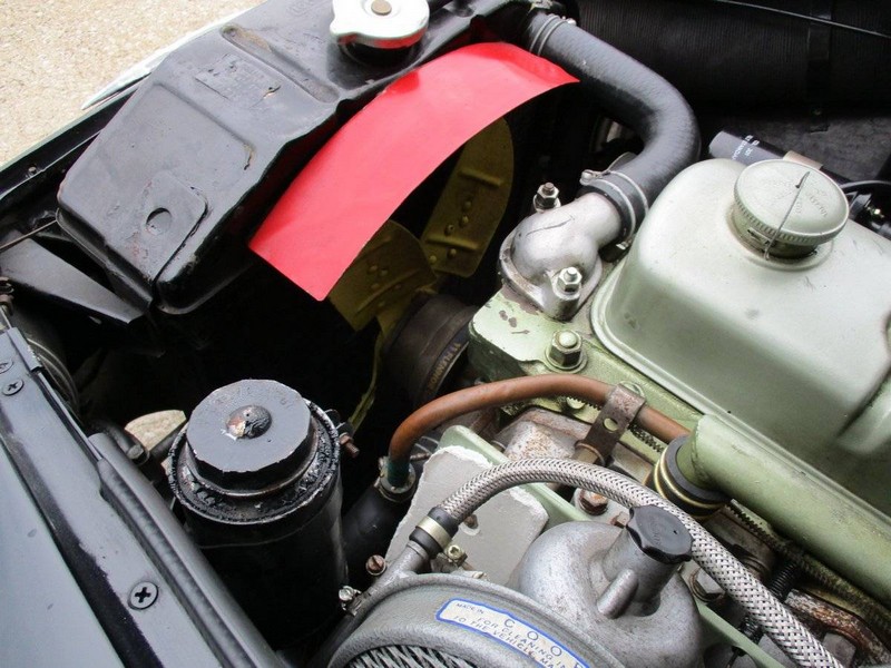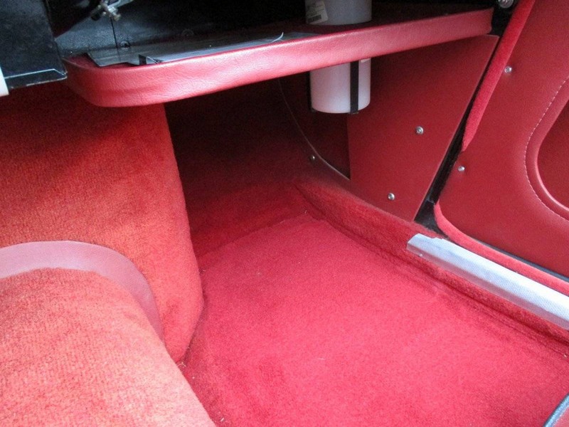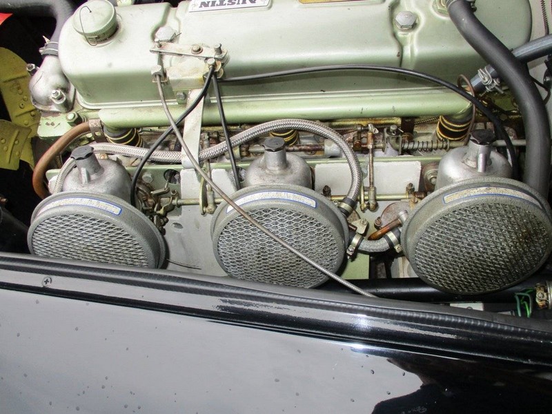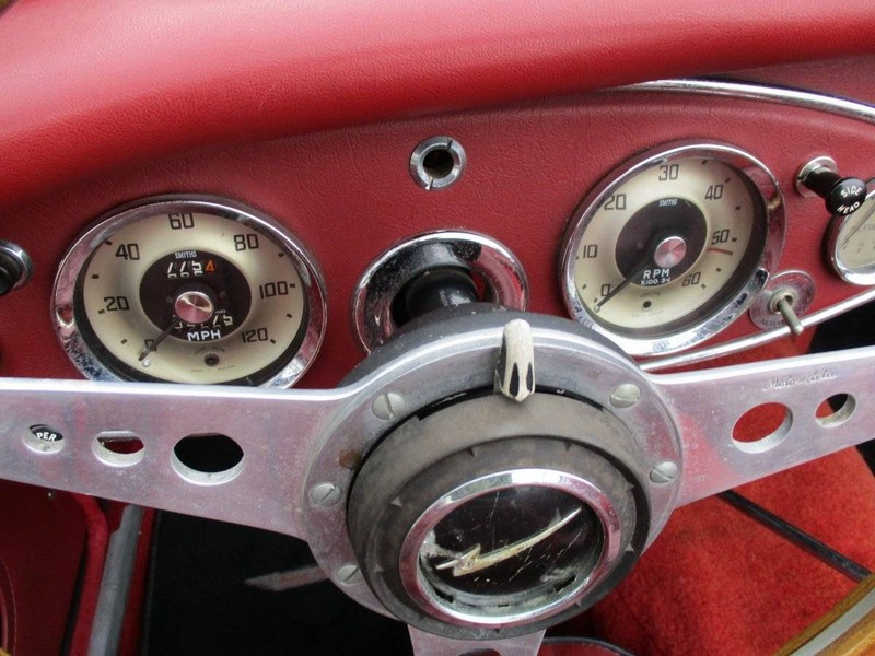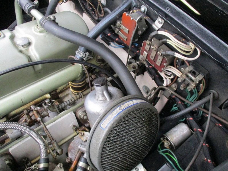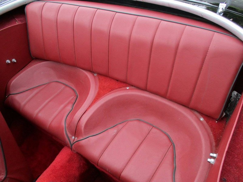 This car sports triple SU HS4 carburetors, a folding roof, chrome wire wheels, heater, a laminated windscreen, and two-tone paint. It also has a tonneau that covers both front and rear seats. Car comes with convertible top and set of side curtains.