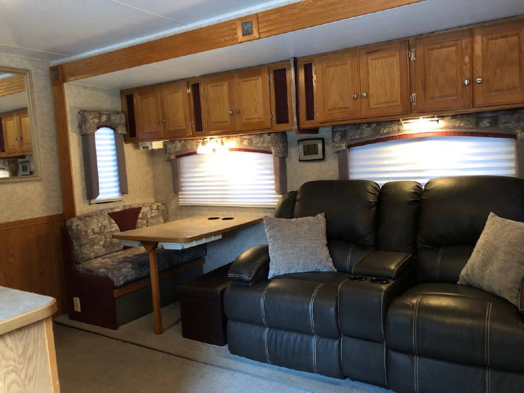 This motorhome has many upgrades, including stainless steel on walls in kitchen, residential size single bowl kitchen sink, additional outlets and shelves added in bedroom for charging phones, etc. Additional shelves with power outlets and closet for storage in bunk area. Sleep by number bed in bunk area. Central vac system. Steel shelving added in rear enormous garage storage compartment with four point access. Firestone airbags and ugraded shock systems. Outdoor shower and tornado tank cleanout rinsing system. 3 gallon 1 hp air compressor and tinted windows.