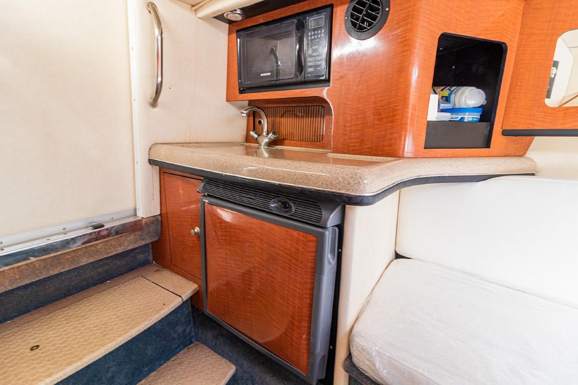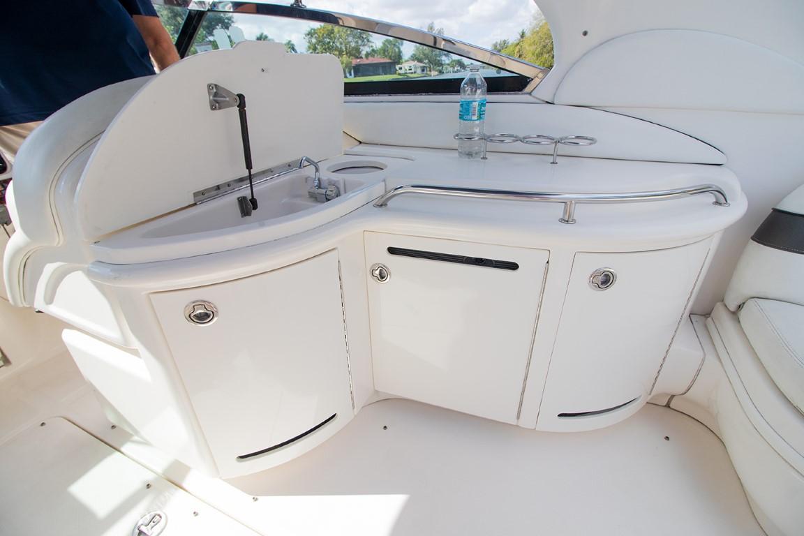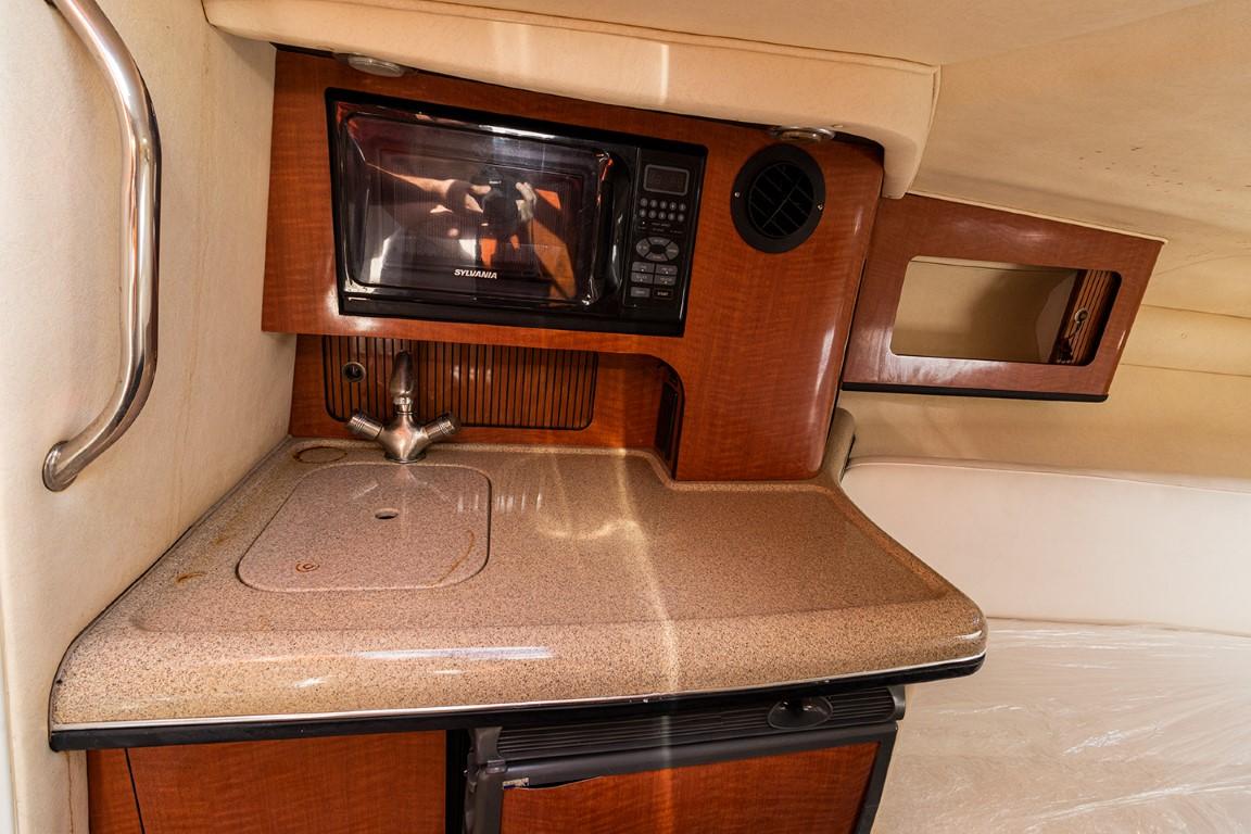 The spacious cockpit features wraparound lounge seating port to aft, a Galley with sink, refrigerator and microwave oven to starboard and two captains chairs.