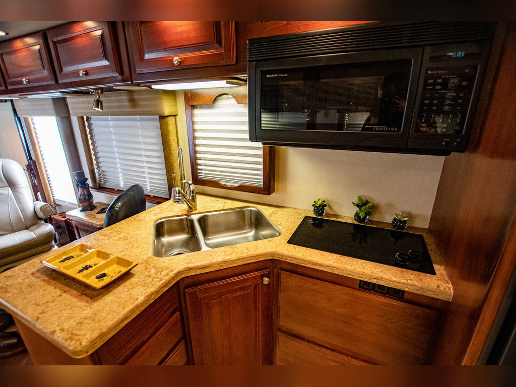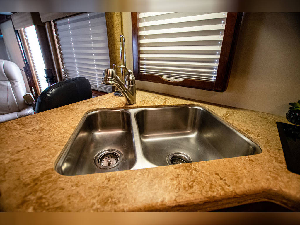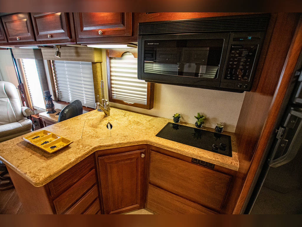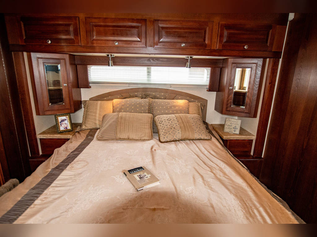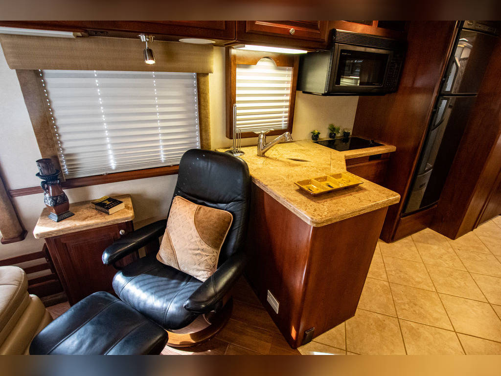 Queen Bed 60″ X 76″ Solid Surface Counter tops Through-out Fabric Jack-Knife Sofa Bed CS Leather Euro Recliner & Desk