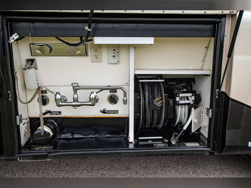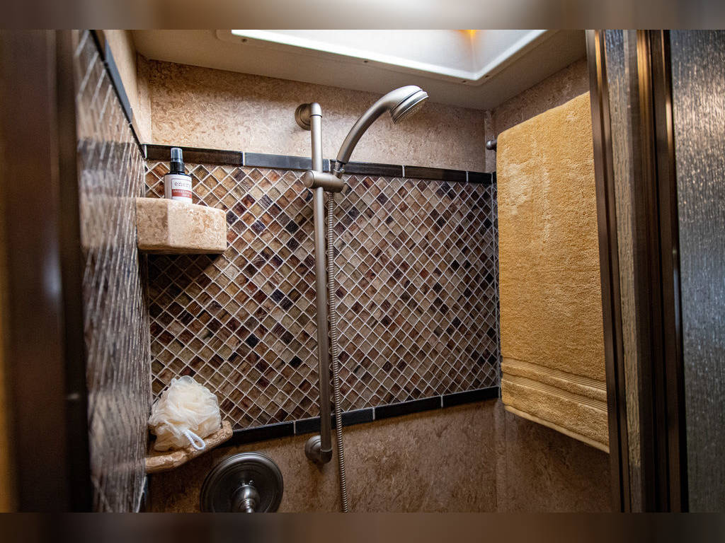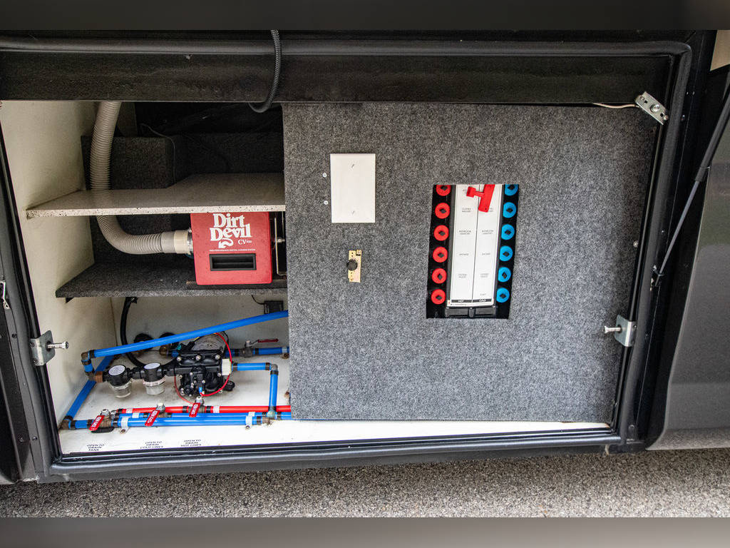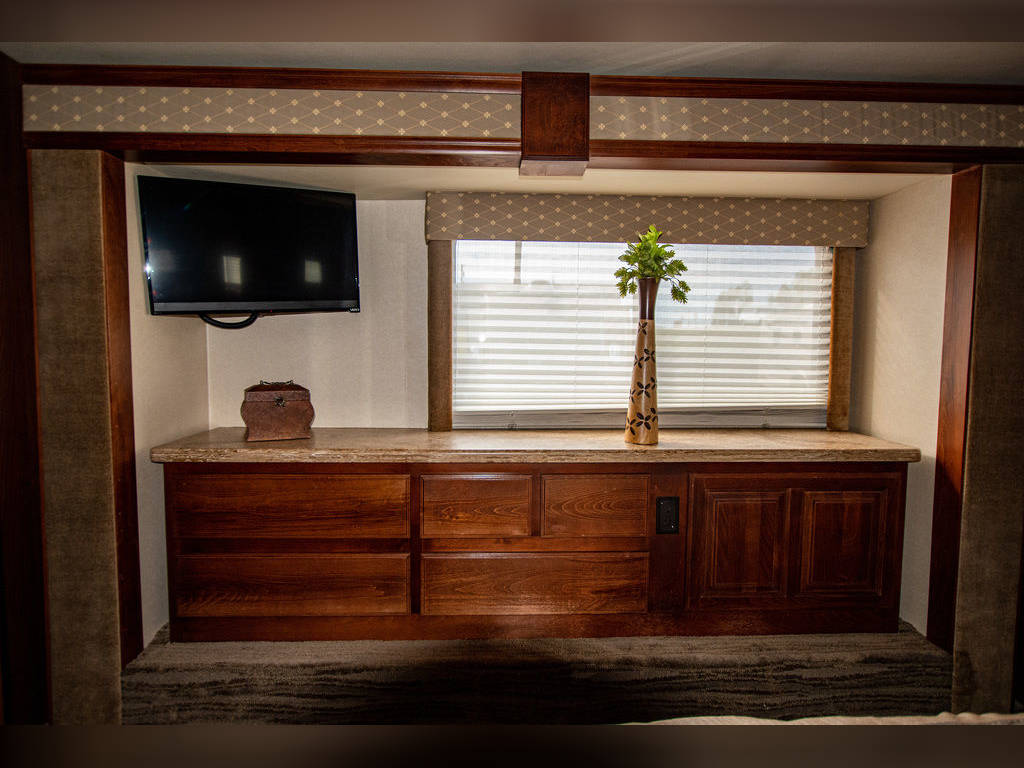 Aux 12v air compressor Topper Awnings Automatic entry step Exterior Height 12’3″ Gray Water Capacity 100 Gal. LP Capacity 17 Gal. Power Cord & Water Hose Reels Heated & Remote Exterior Mirrors CS Bed Room Bed Slide 8′ X 17″ Flush Slide Rooms With Pneumatic Seals