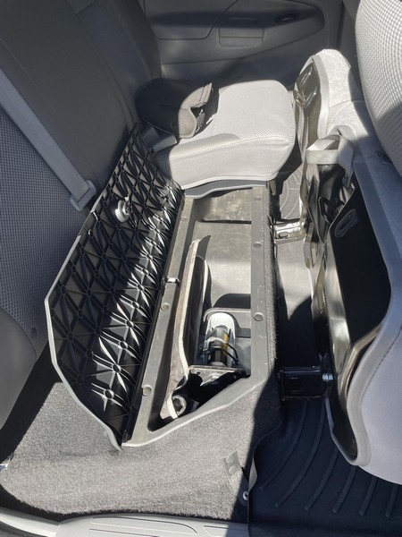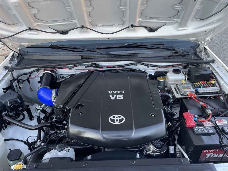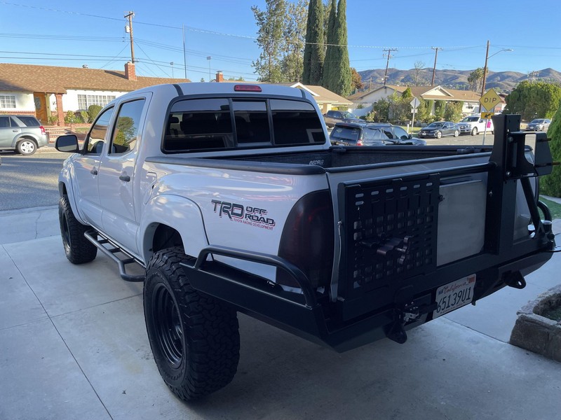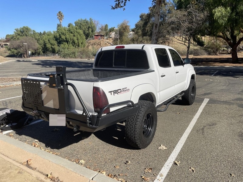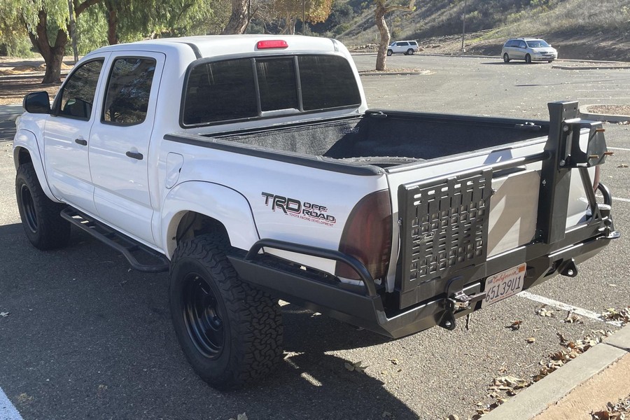 Modifications to this Tacoma are extensive, and the full list is detailed below. Highlights include a 4.56 rear gear ratio, 17-inch F5 Stealth Custom Series matte black wheels with BFGoodrich All-Terrain T/A KO2 tires, King 2.5-inch remote reservoir front coilovers, Dobinsons l59-111-R rear leaf springs, All-Pro Off-Road rock sliders, a Brute Force Fab high-clearance rear bumper with swing-out tire and table, and a GGLighting 30-inch front light bar. Power comes from a 4.0-liter V6, rated at 236 horsepower and 266 lb-ft of torque. Output is sent to the rear or all four wheels via a 5-speed automatic transmission and Toyota’s 4WDemand part-time 4-wheel-drive system with a 2-speed transfer case.
