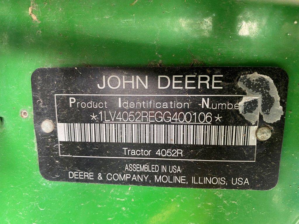 2016 John Deere, 4052R, FULLY ENCLOSED CAB, 561 HOURS, 4X4, 3 POINT, 540 PTO, DRAWBAR, BRUSHGUARD, HEAT & A/C, RADIO, 3 RANGE HYDROSTATIC TRANMISSION, 51 HP YANMAR DIESEL ENGINE, 3,770 LB OPERATING WEIGHT, 74″ BUCKET, 10-16.5 FRONT TIRES, 16.9-24 REAR TIRES, FRESH SERVICE & MULTI-POINT INSPECTION COMPLETED BY A CERTIFIED TECHNICIAN.