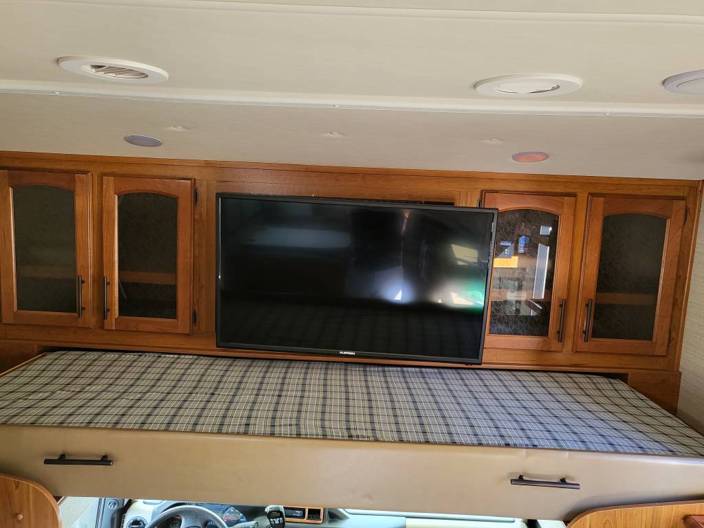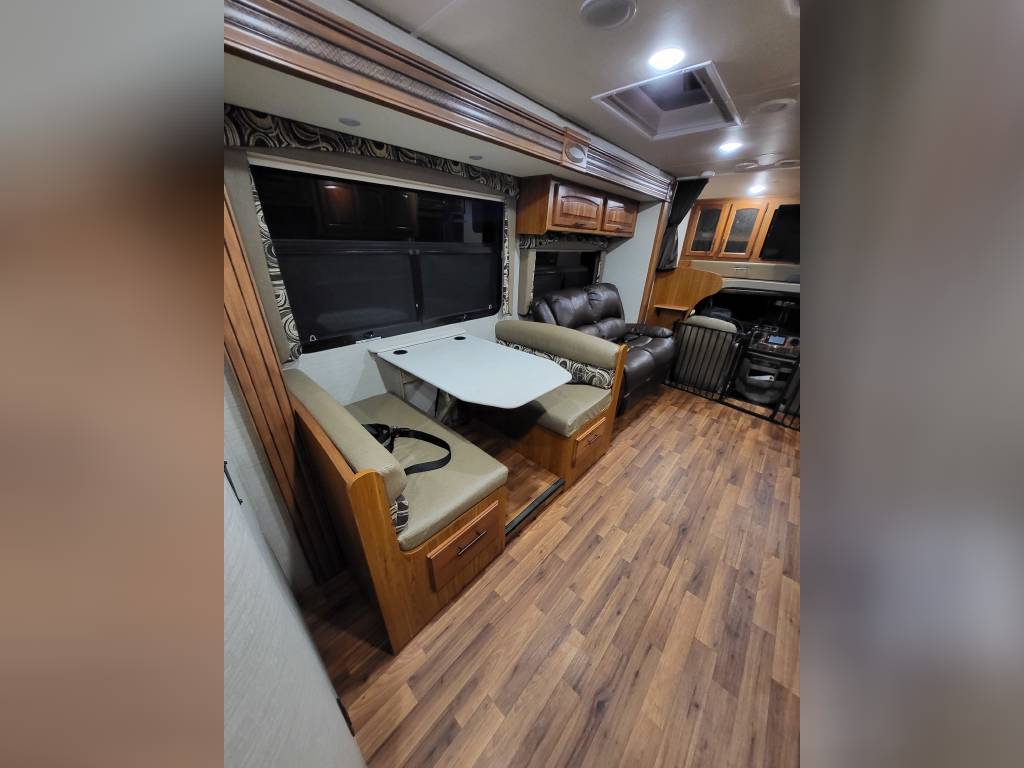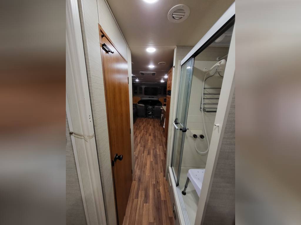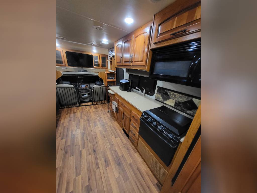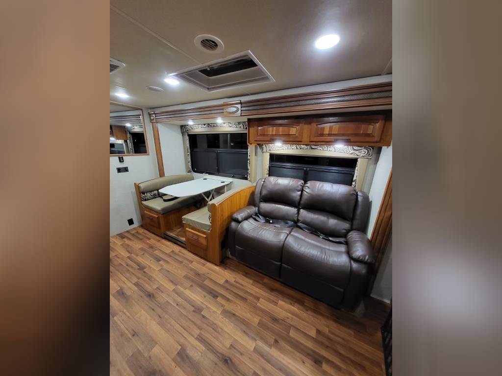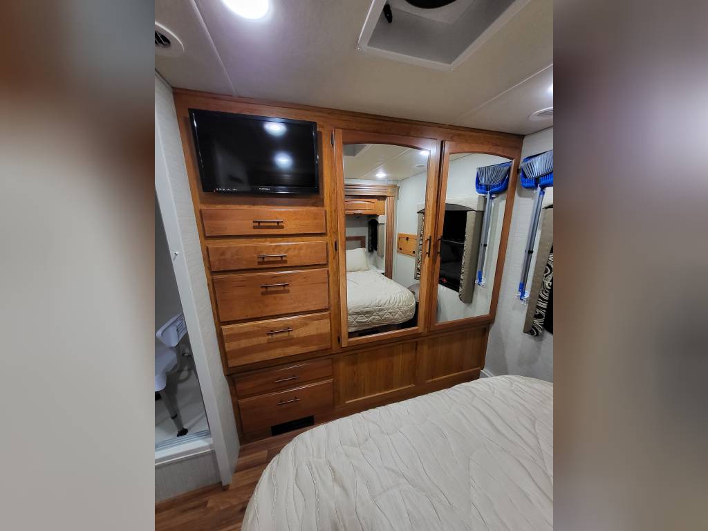 F450, Ford V10, Smoke Free, Onan Generator 525hrs, Automatic leveling system, 2 slideouts, Blackwater flushout, Outside shower, Country Fill Option, Front entertainment Center package with flat screen TV and sleeping area, TV in bedroom, Instant Hot water heater, Ducted Heat and Air, Water Filtration System, 4 Door extra large refrigerator with wood accent, Tank Heaters, J Ride stabilization system with Bilstein Shocks.