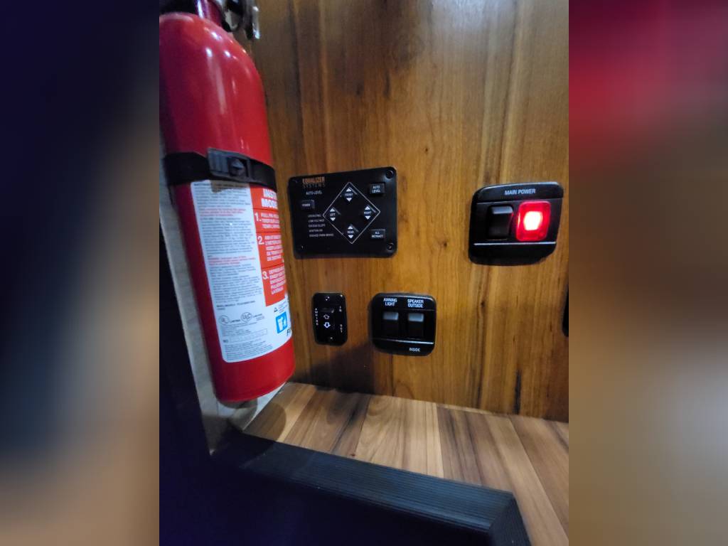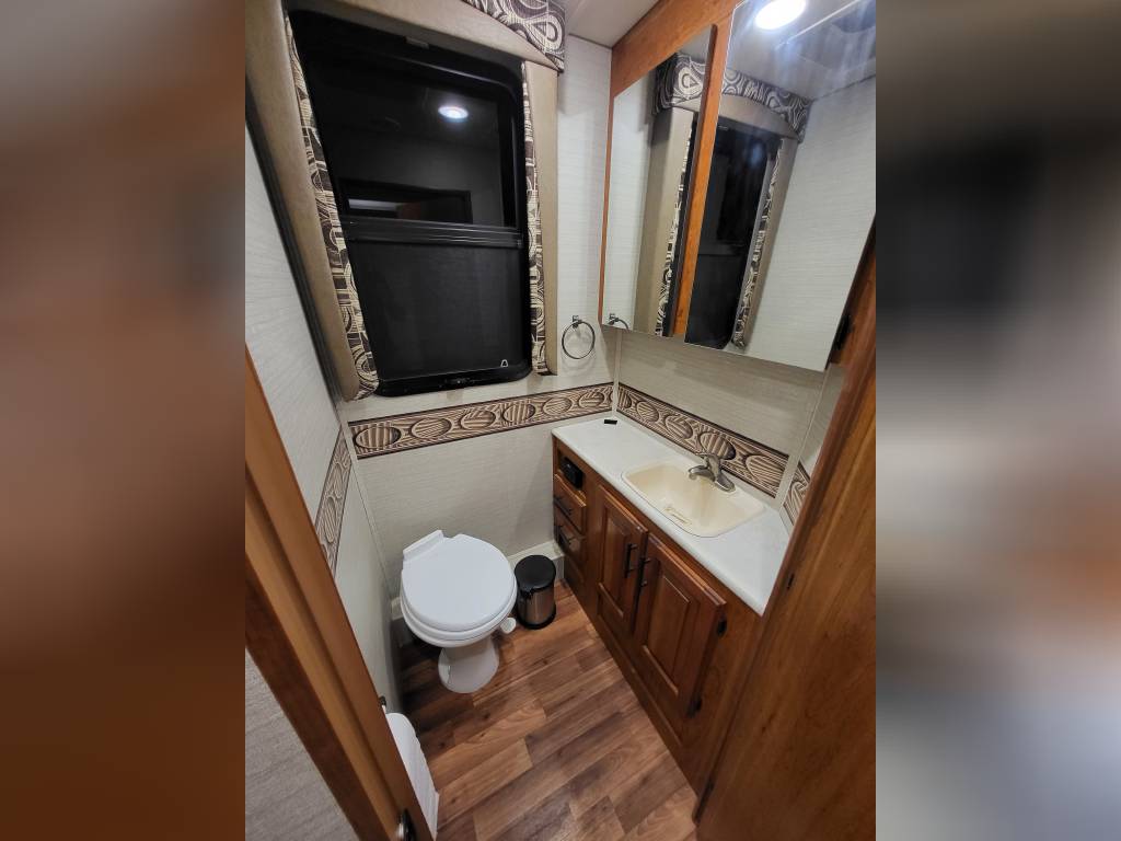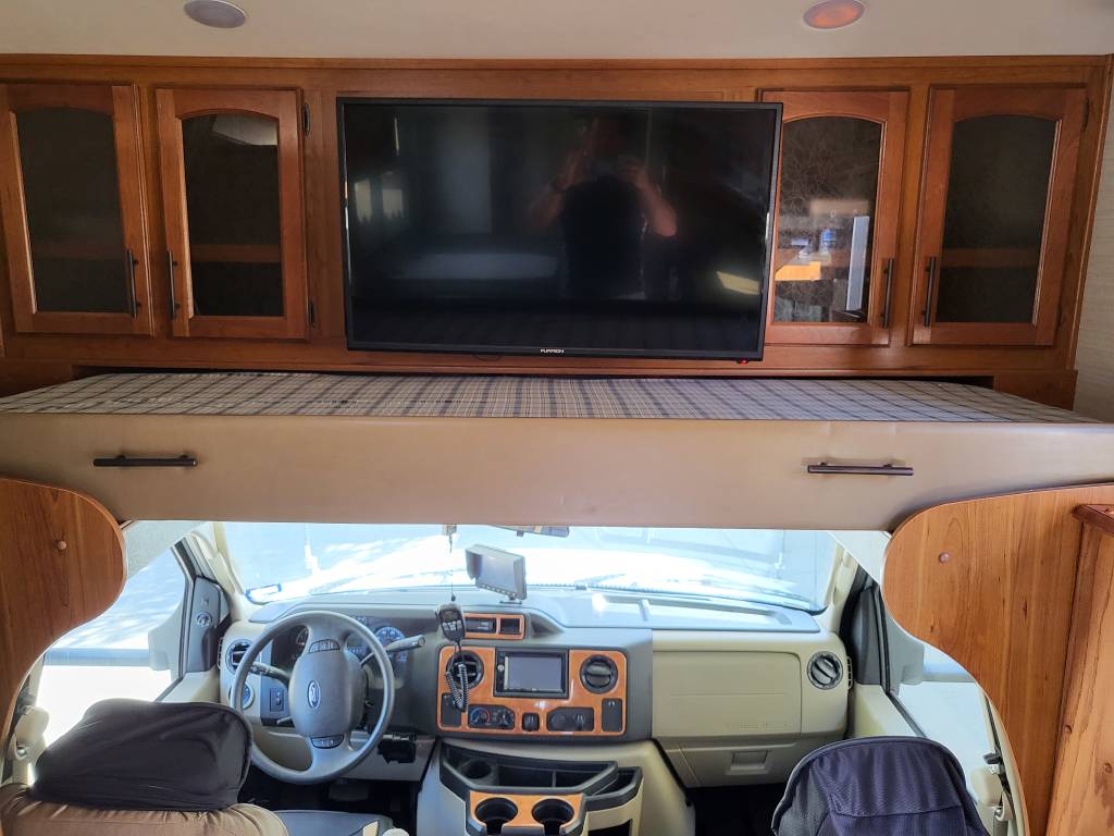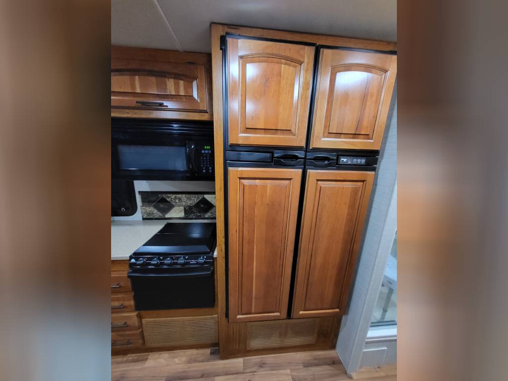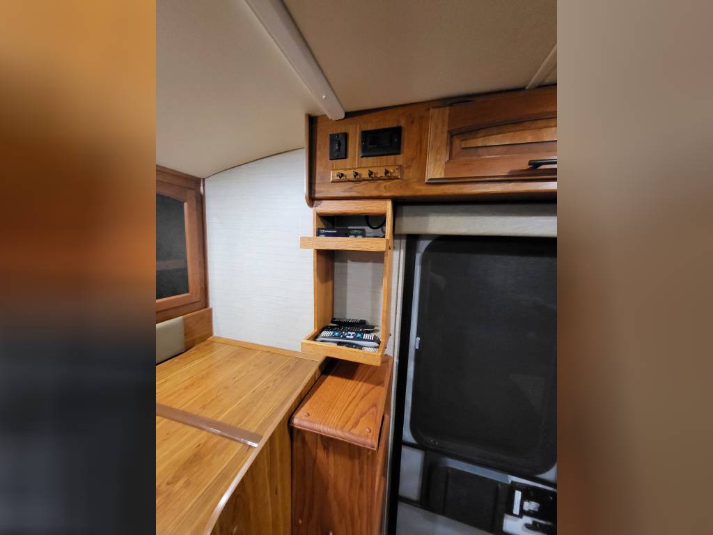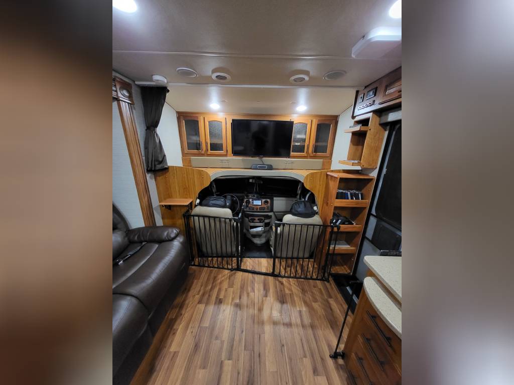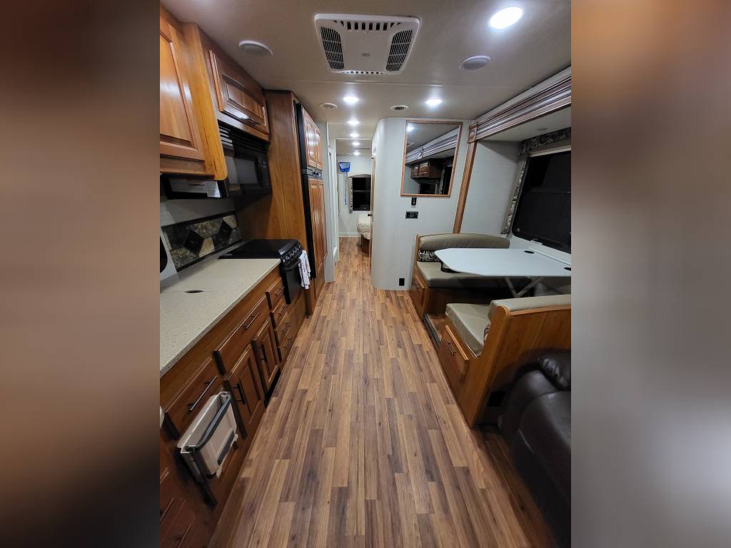 F450, Ford V10, Smoke Free, Onan Generator 525hrs, Automatic leveling system, 2 slideouts, Blackwater flushout, Outside shower, Country Fill Option, Front entertainment Center package with flat screen TV and sleeping area, TV in bedroom, Instant Hot water heater, Ducted Heat and Air, Water Filtration System, 4 Door extra large refrigerator with wood accent, Tank Heaters, J Ride stabilization system with Bilstein Shocks.