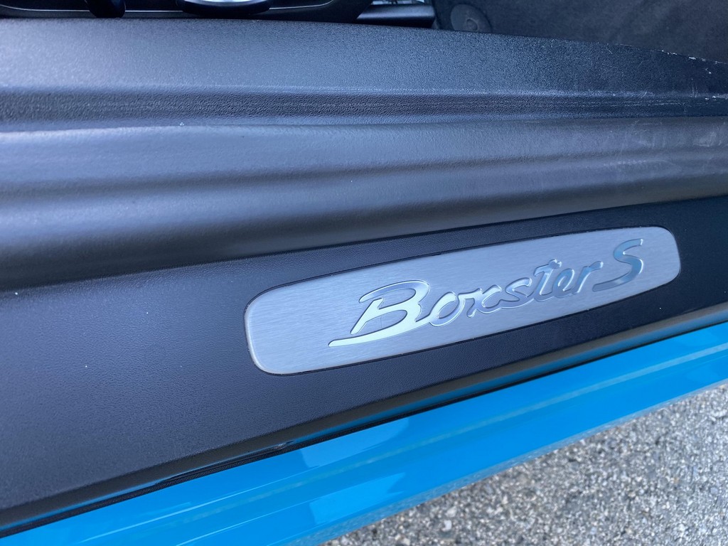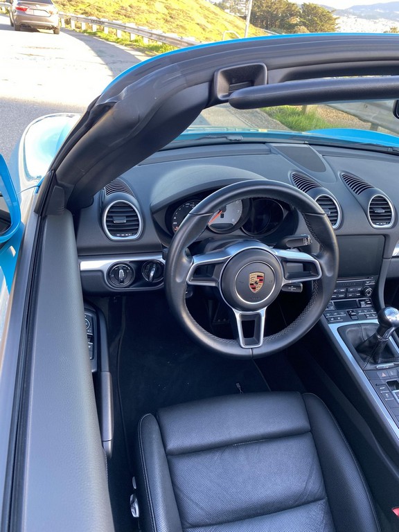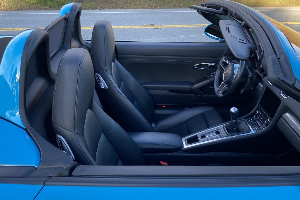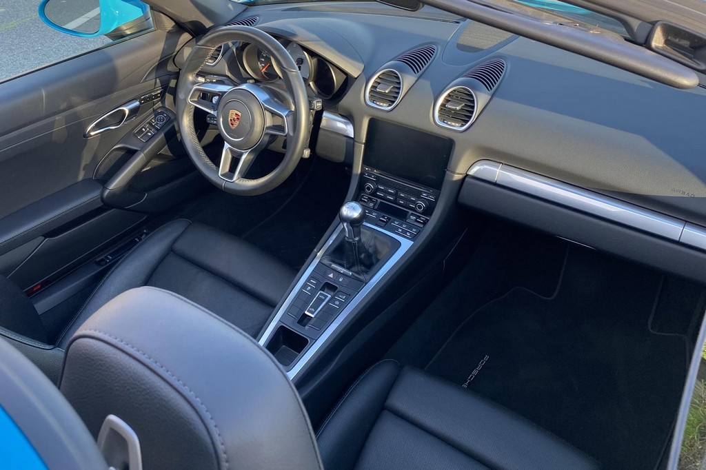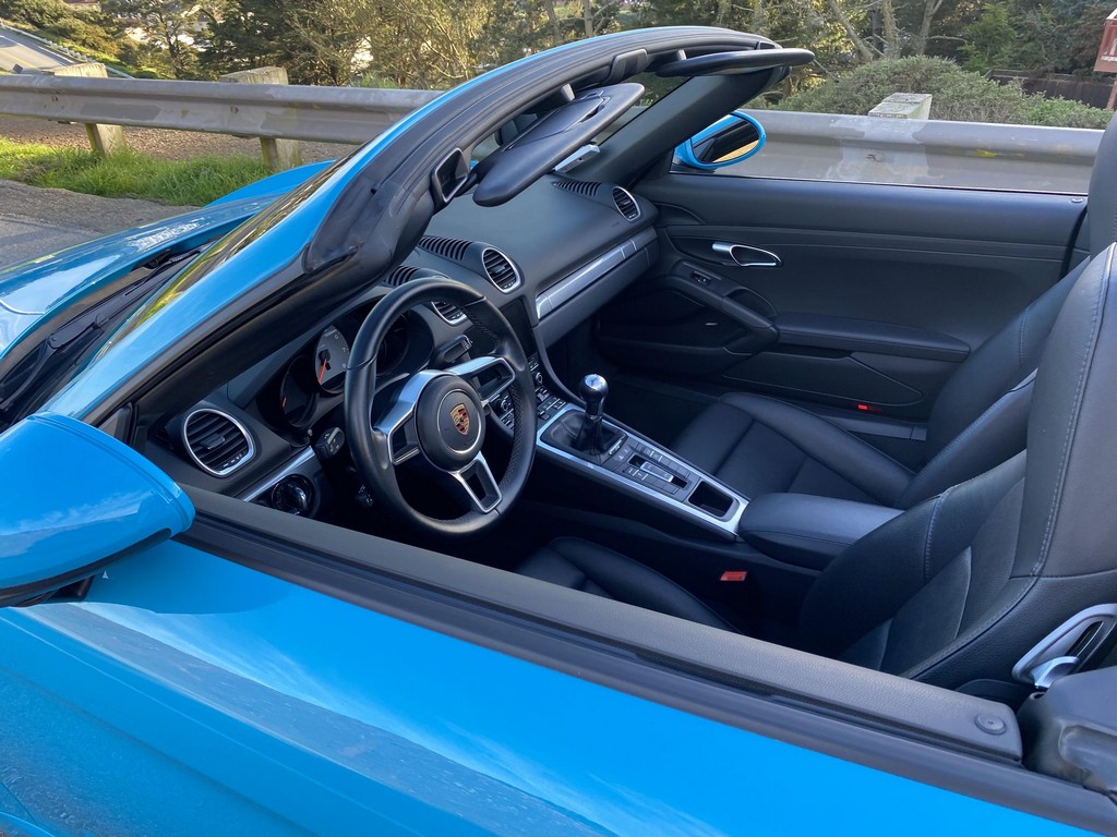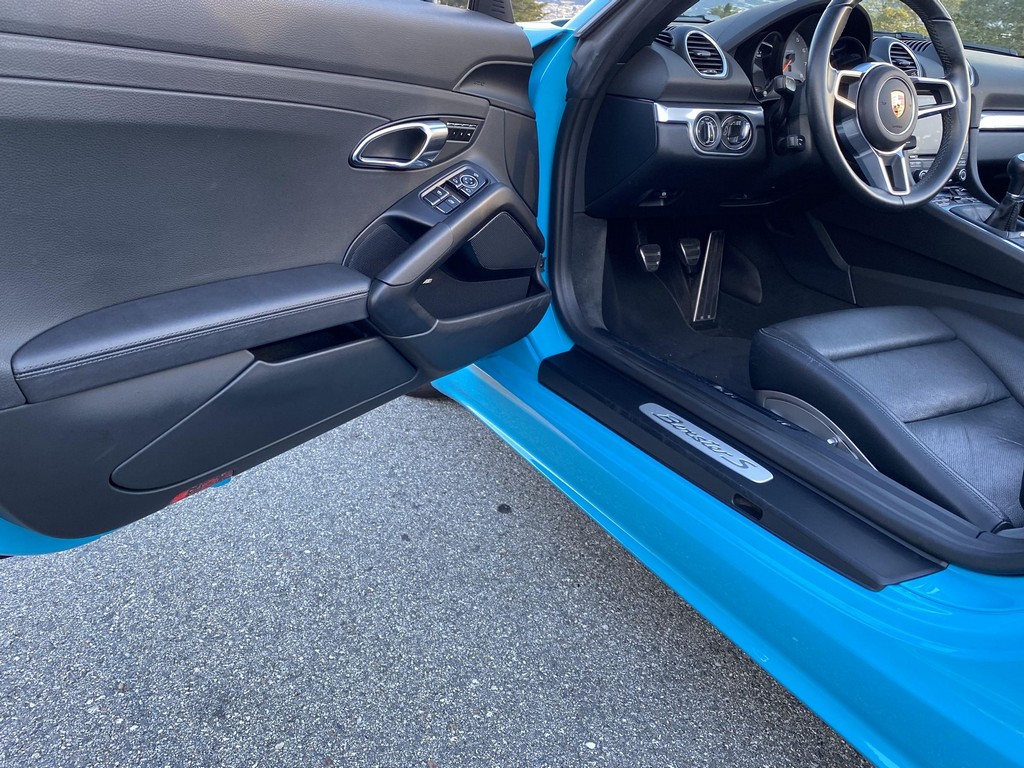 THIS… is a 2017 Porsche Boxster S, finished in Miami Blue with a black soft top and a black interior. The attached Carfax history report shows no accidents or mileage discrepancies in this Boxster’s past. Factory equipment includes the Premium Package Plus, which adds bi-xenon PDLS adaptive headlights, power-adjustable heated and ventilated sport seats with memory function, dual-zone automatic climate control, ambient lighting, rain-sensing wipers, and the Porsche Entry & Drive keyless system. Other notable equipment includes 20-inch Carrera S wheels, a body-colored roll bar, black sport tailpipes, and more as listed below. Modifications reported by the seller are limited to Euro-spec white side reflectors and a set of AlloyGator wheel curb protectors. The “982” generation of the mid-engine Porsche 718 Boxster introduced a new range of turbocharged 4-cylinder engines, replacing the 6-cylinder powerplants of previous Boxster models. The intent was to increase performance and efficiency but retain the nimble handling and distinct styling of past Boxsters. Power comes from a turbocharged 2.5-liter flat-4 engine, rated at 350 horsepower and 309 lb-ft of torque. Output is sent to the rear wheels via a 6-speed manual transmission.