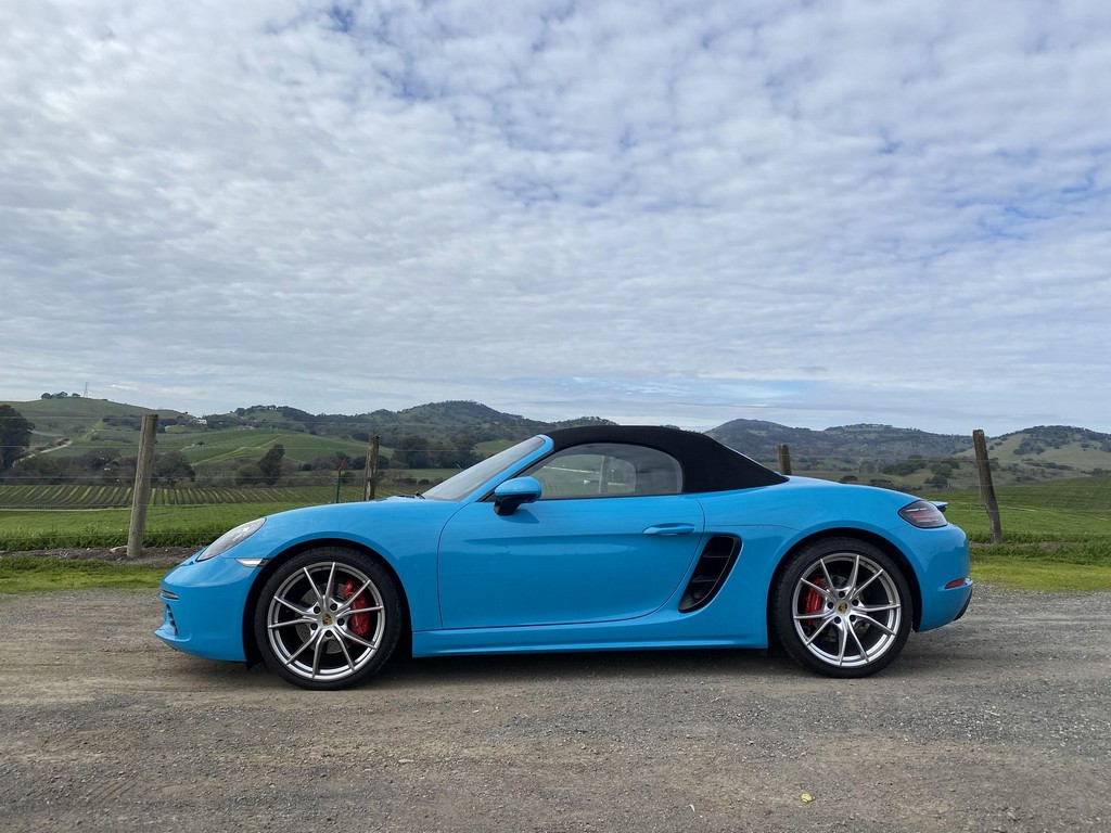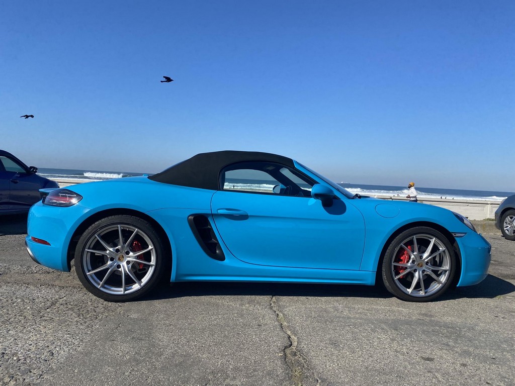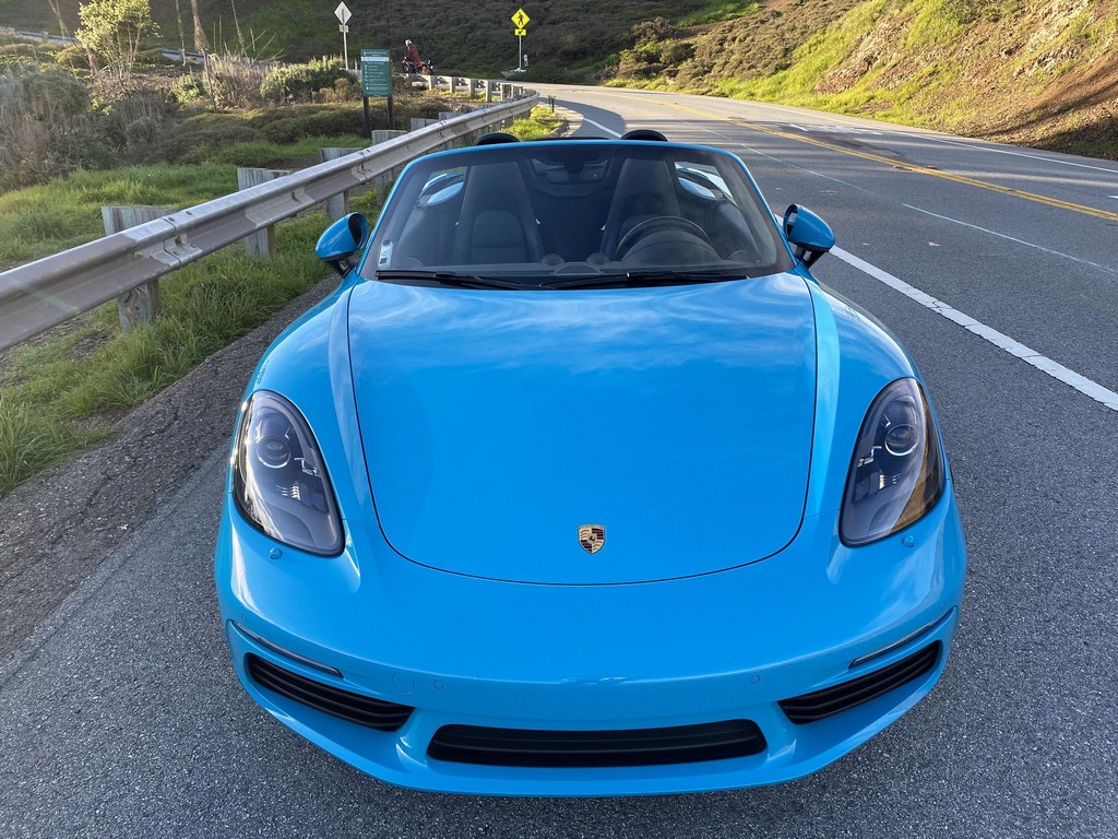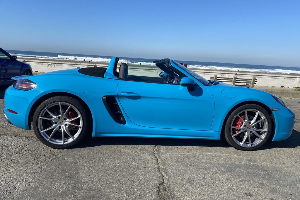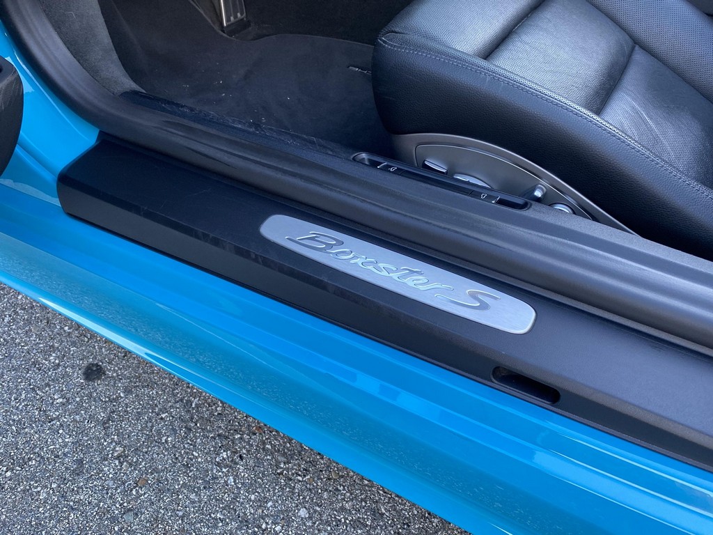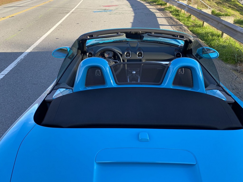 THIS… is a 2017 Porsche Boxster S, finished in Miami Blue with a black soft top and a black interior. The attached Carfax history report shows no accidents or mileage discrepancies in this Boxster’s past. Factory equipment includes the Premium Package Plus, which adds bi-xenon PDLS adaptive headlights, power-adjustable heated and ventilated sport seats with memory function, dual-zone automatic climate control, ambient lighting, rain-sensing wipers, and the Porsche Entry & Drive keyless system. Other notable equipment includes 20-inch Carrera S wheels, a body-colored roll bar, black sport tailpipes, and more as listed below. Modifications reported by the seller are limited to Euro-spec white side reflectors and a set of AlloyGator wheel curb protectors. The “982” generation of the mid-engine Porsche 718 Boxster introduced a new range of turbocharged 4-cylinder engines, replacing the 6-cylinder powerplants of previous Boxster models. The intent was to increase performance and efficiency but retain the nimble handling and distinct styling of past Boxsters. Power comes from a turbocharged 2.5-liter flat-4 engine, rated at 350 horsepower and 309 lb-ft of torque. Output is sent to the rear wheels via a 6-speed manual transmission.