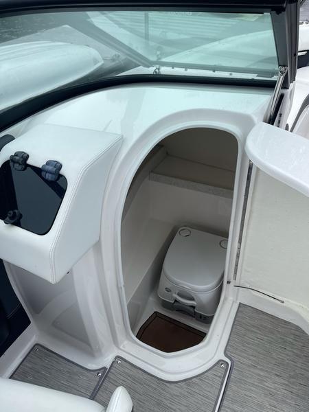 The head features a soft step floor, adding to the overall look and feel of the boat.