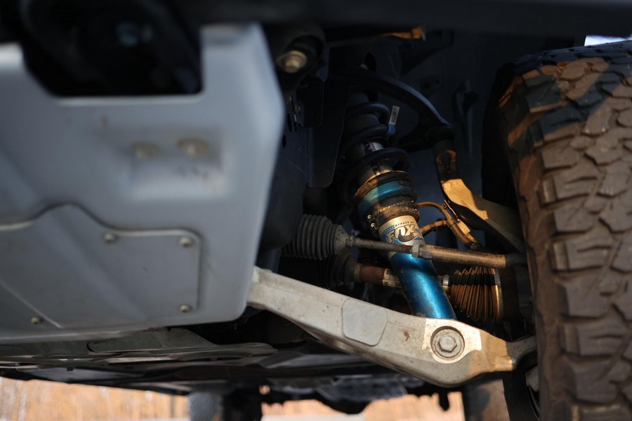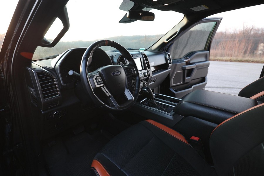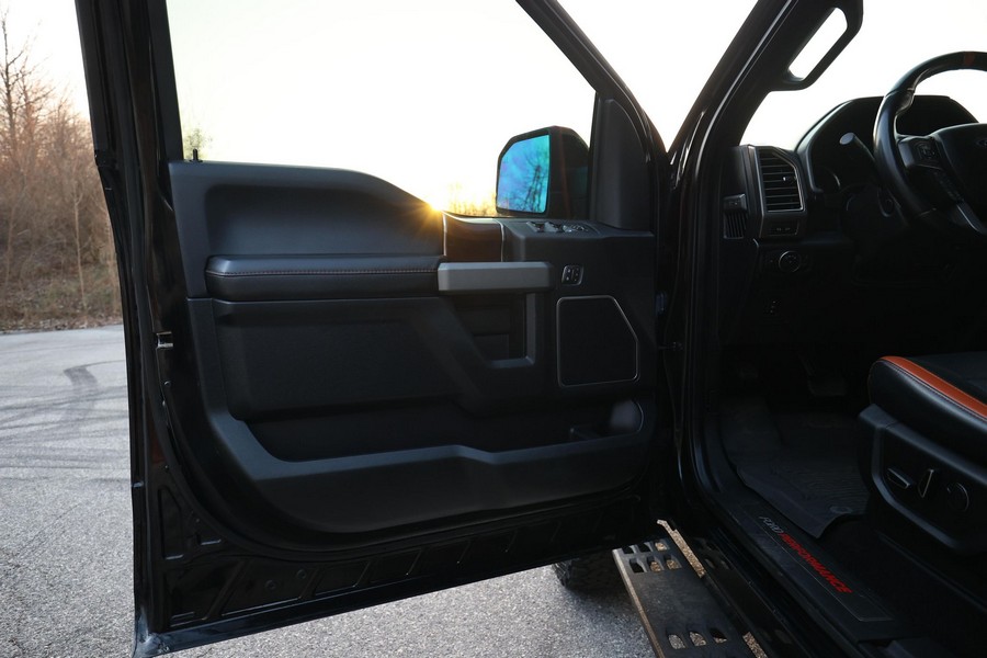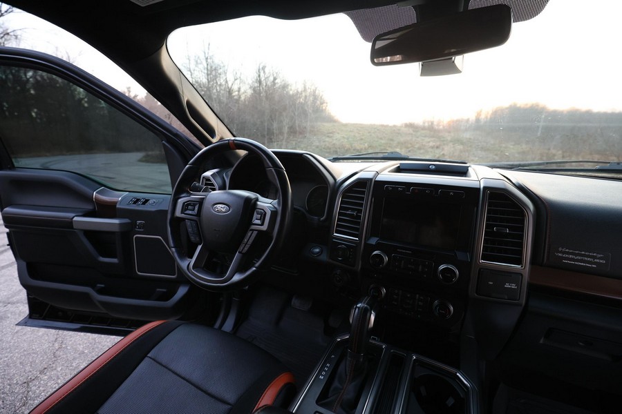 Equipment Group 802A (4.10 front axle with Torsen differential, LED lighting in the cargo box, LED spotlights integrated into the mirrors, remote engine starter, heated steering wheel, power-sliding rear window, automatic climate control, inflatable rear seat belts, B&O Play sound system, Sync 3 infotainment system, navigation system, 360-degree camera, pro trailer back-up assist, and blind-spot information system with trailer tow monitoring)