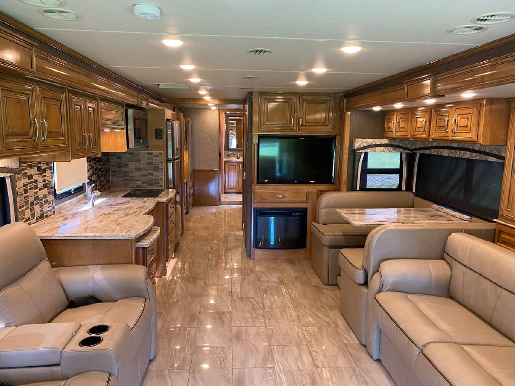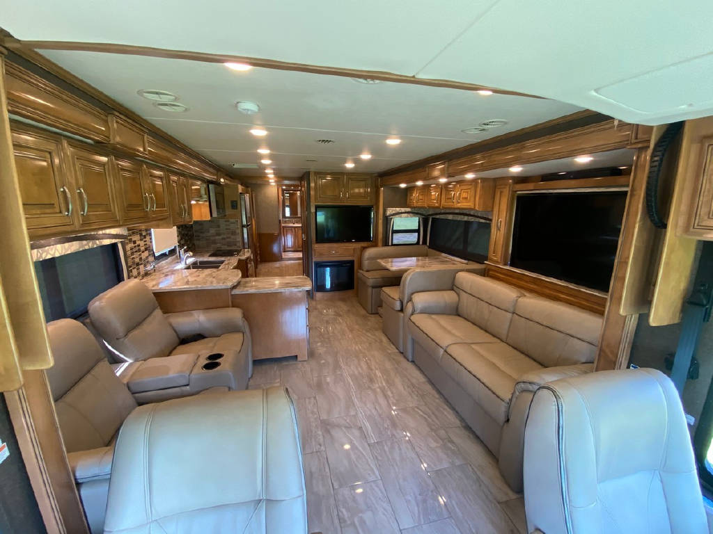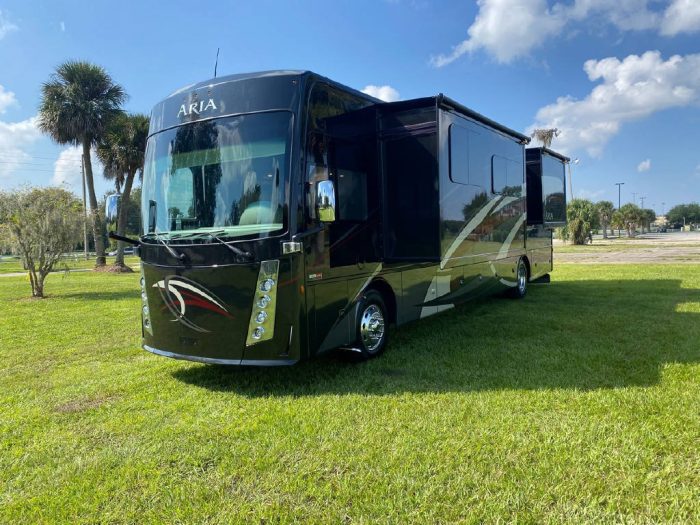 2018 Thor Aria 3901 3 slide motorhome with only 13001 miles. This coach is on a Freightliner chassis powered by a 360HP Cummins Diesel with Allison Transmission. This coach is brand new!! & includes a retractable HDTV, dream dinette table, reclining theater seating, pull out cabinet, fireplace, residential fridge, more HD TVs, Tilt-a-view inclining king bed, drop-down overhead bunk, stacked washer/dryer, outdoor entertainment & more !!!!!