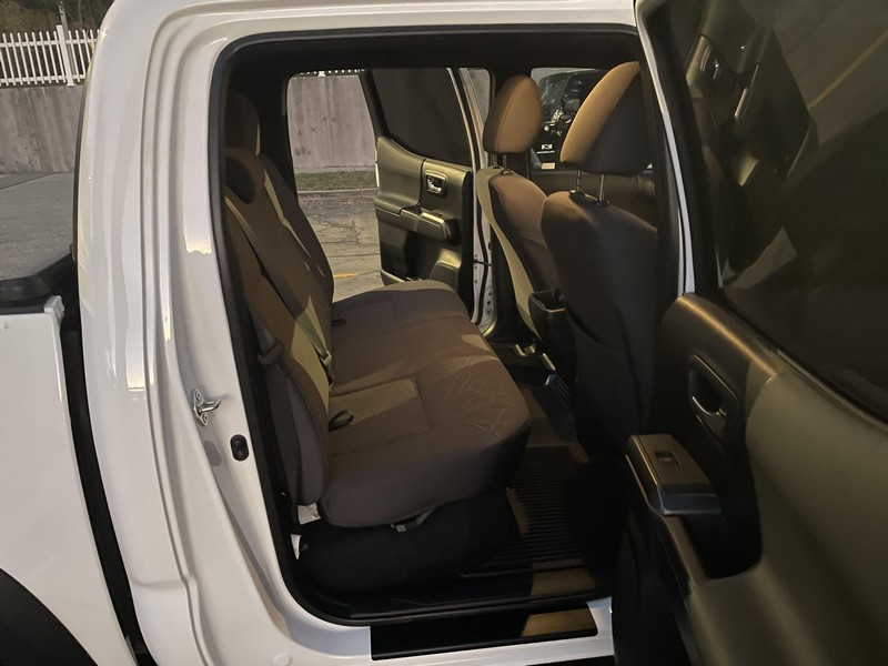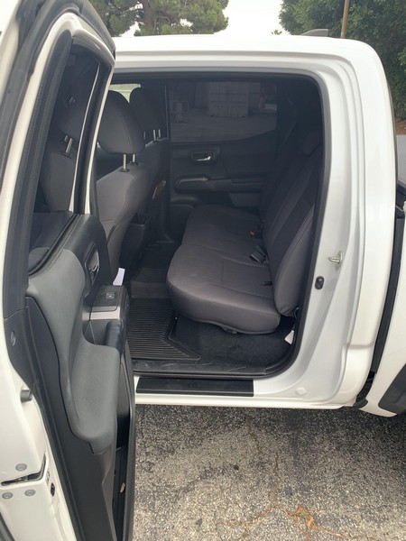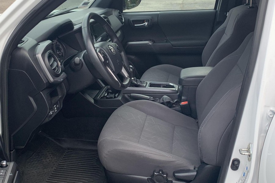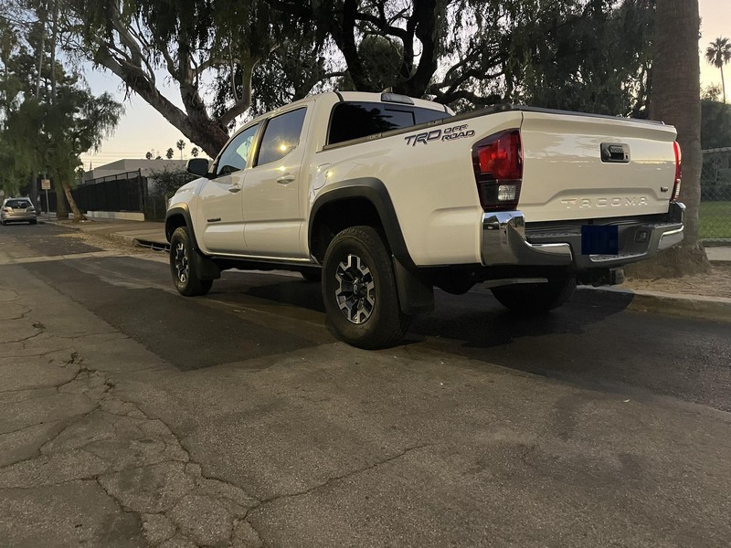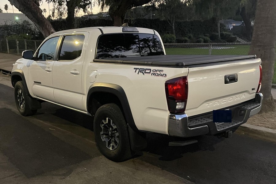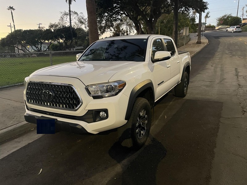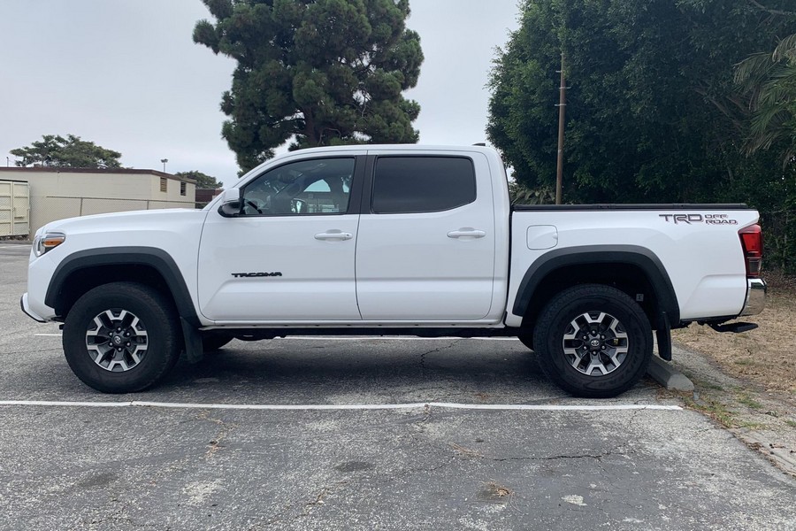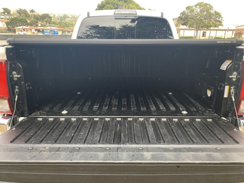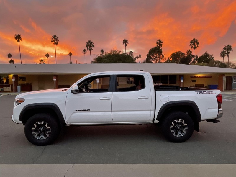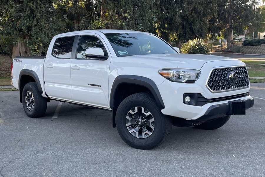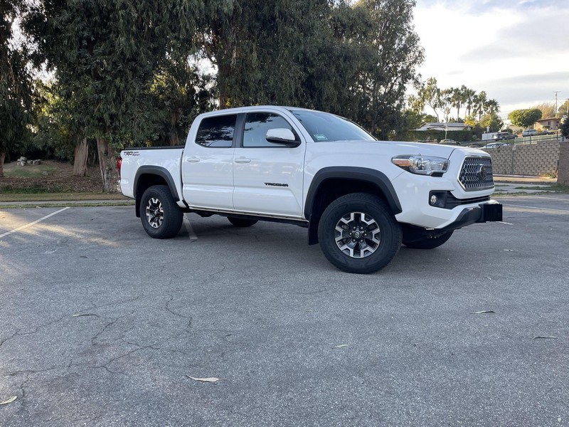 THIS… is a 2018 Toyota Tacoma TRD Off-Road Double Cab, finished in Super White with a Graphite interior. The attached Carfax history report shows no accidents or mileage discrepancies; it also shows that this Tacoma has been registered in California since new. Factory equipment includes a locking rear differential, off-road-tuned suspension with Bilstein shocks, a bed step, a 120V/400W in-deck AC power outlet, a power-sliding rear window with privacy glass, remote keyless entry, a wireless charger, and Toyota Safety Sense P safety systems. The seller reports no modifications. Power comes from a 3.5-liter V6 engine, rated at 278 horsepower and 265 lb-ft of torque. Output is sent to the rear wheels via a 6-speed automatic transmission.