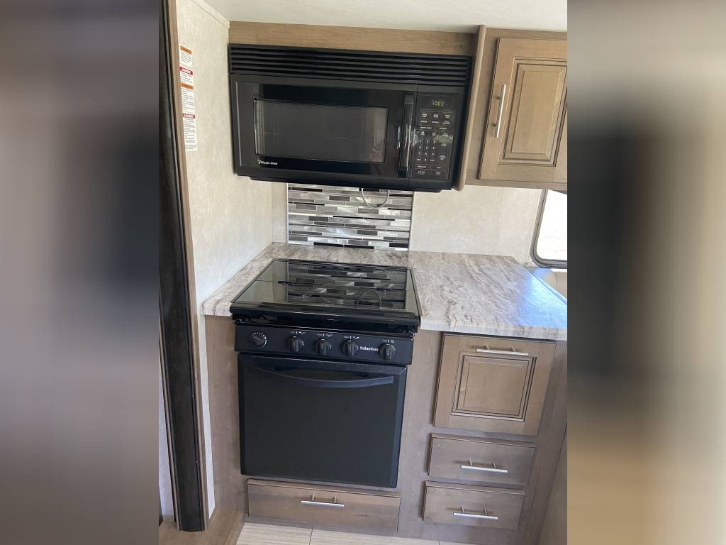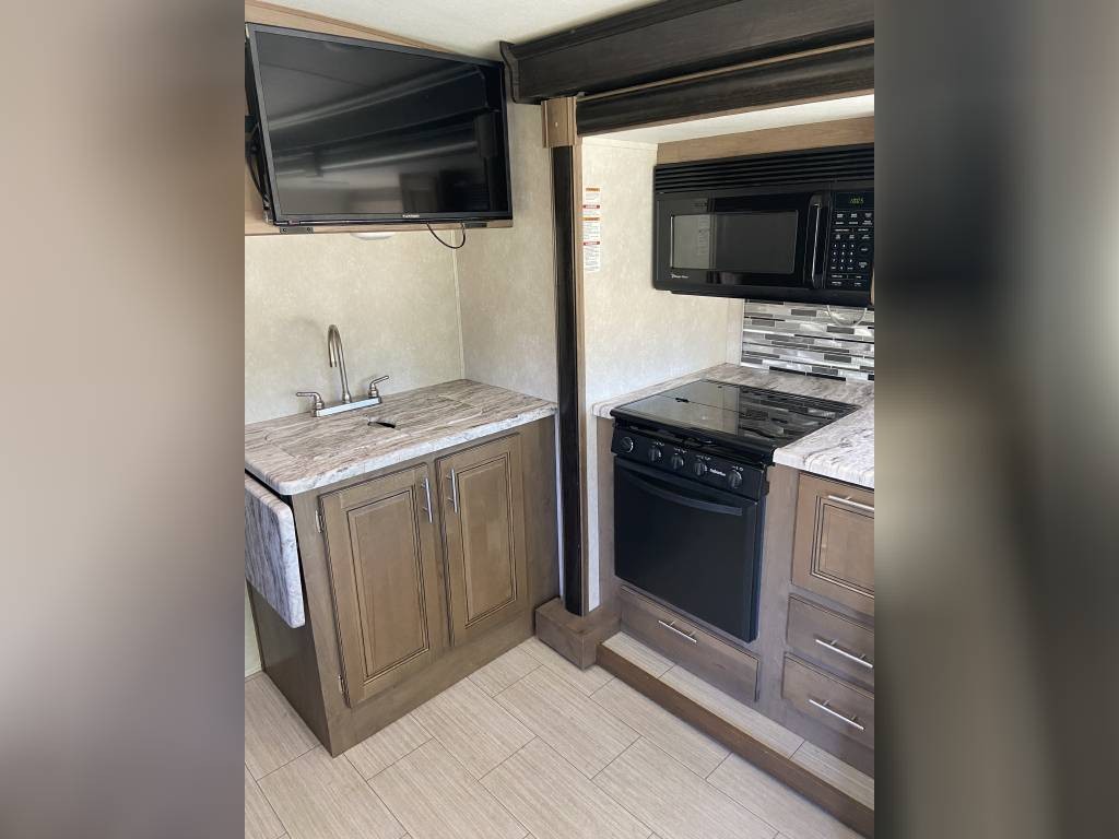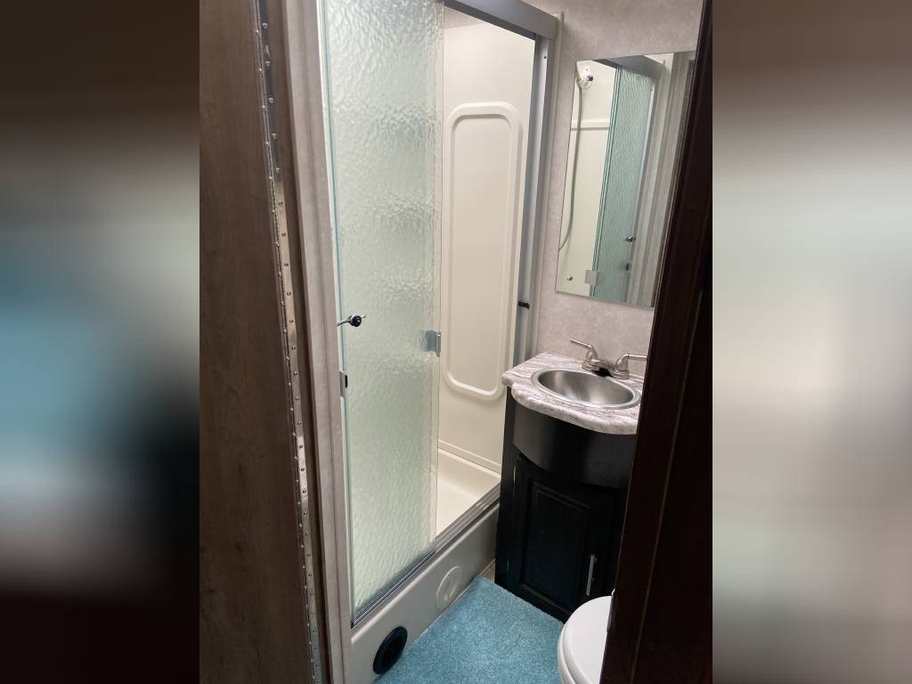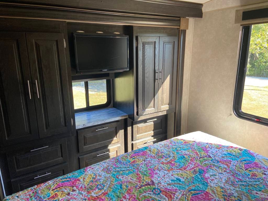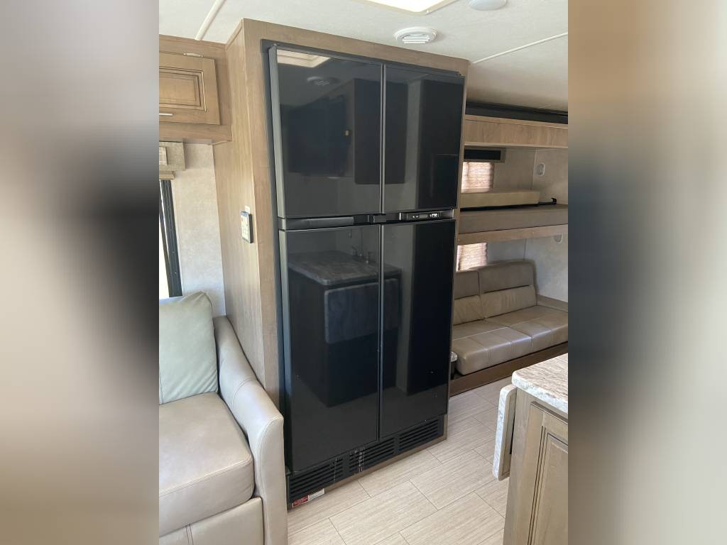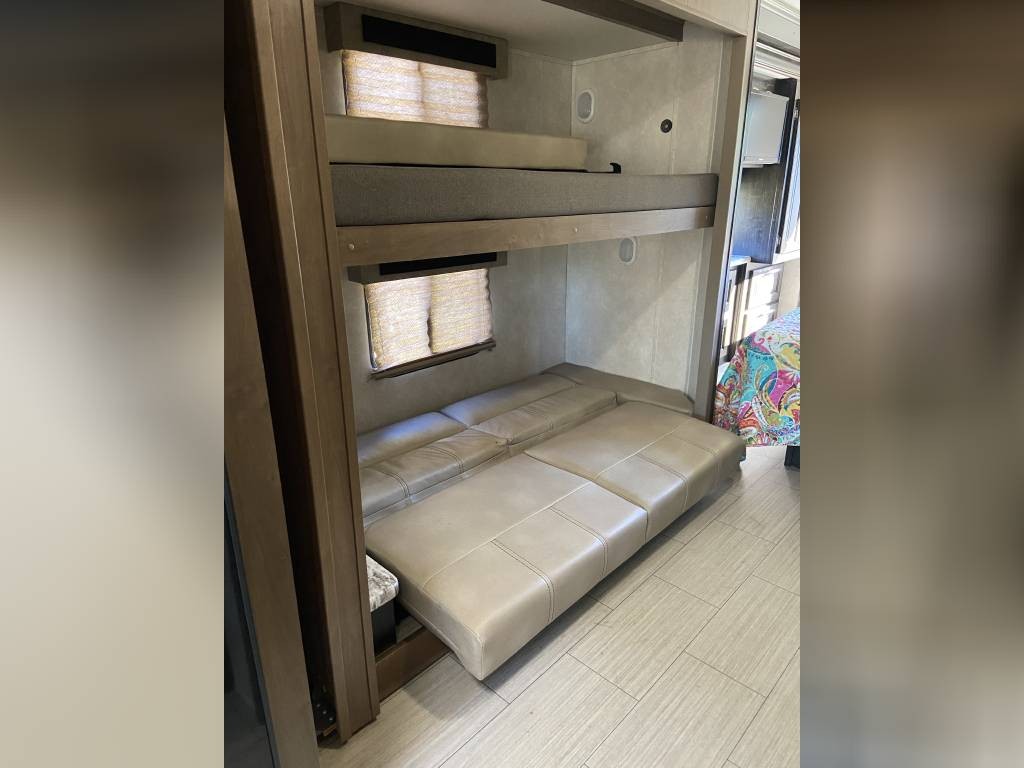 This RV is in excellent condition inside and out. It’s perfect for the whole family with all the sleeping options. King size, private master in rear with lots of wardrobe and drawer space. Bottom bunk is full size and folds up to a couch with seatbelts and a TV that is ideal for the kids on the road. Couch in main area reclines and also folds out into a bed. There are 8 seatbelts total. Upgraded full size ceramic toilet. Electric awning with LED lights. Outdoor entertainment system. Power drop down queen bunk. Power sunshade for the windshield. Side view and back up cameras. Plenty of storage underneath with extra large pass through space in rear. Automatic levelers to make setup quick and easy.