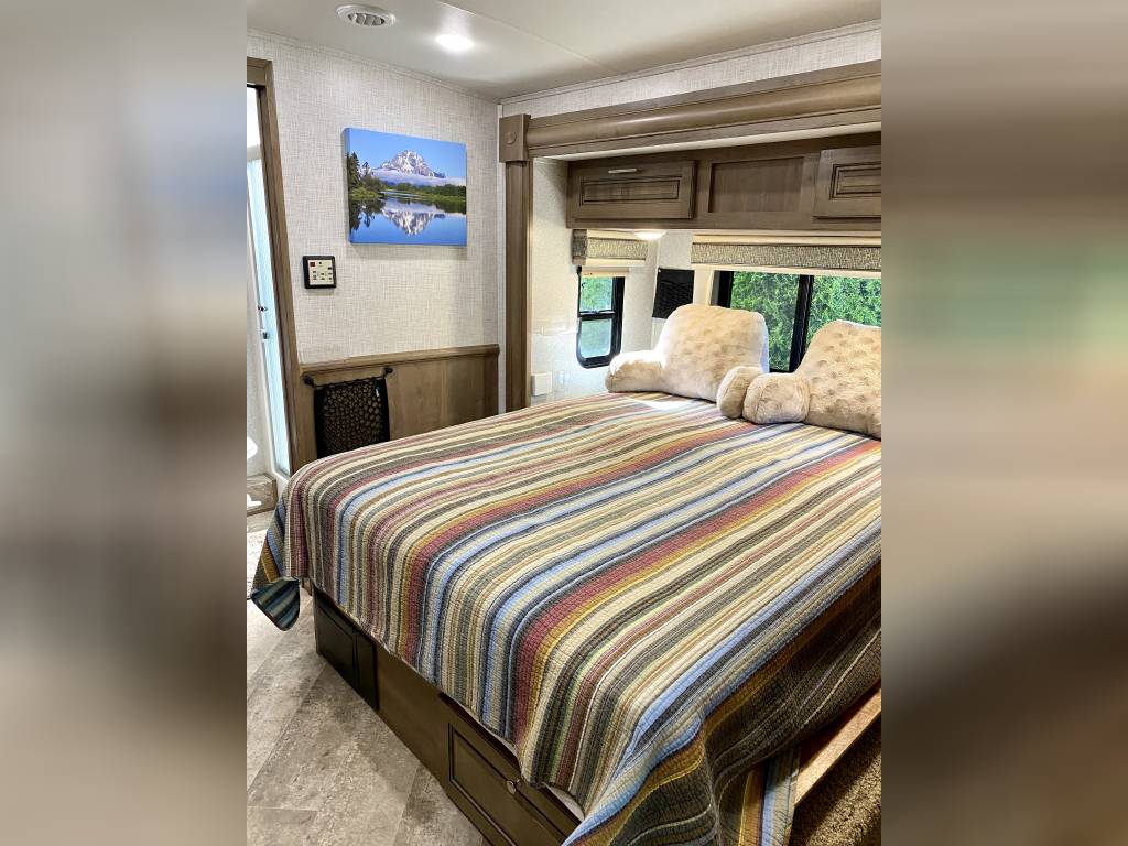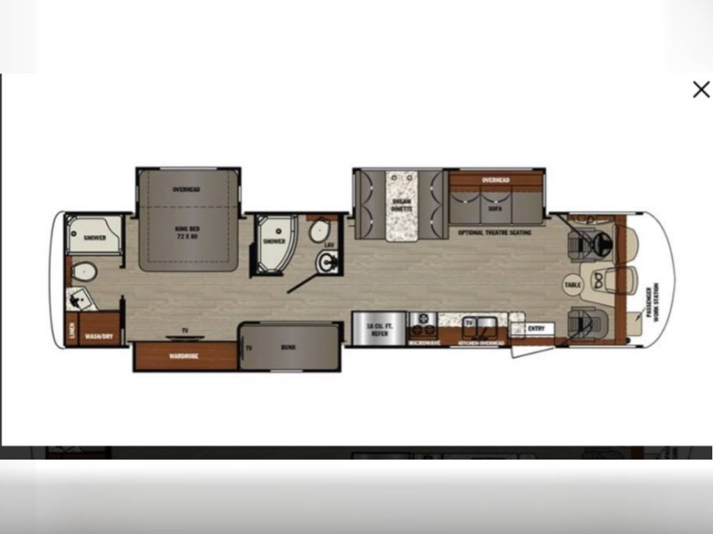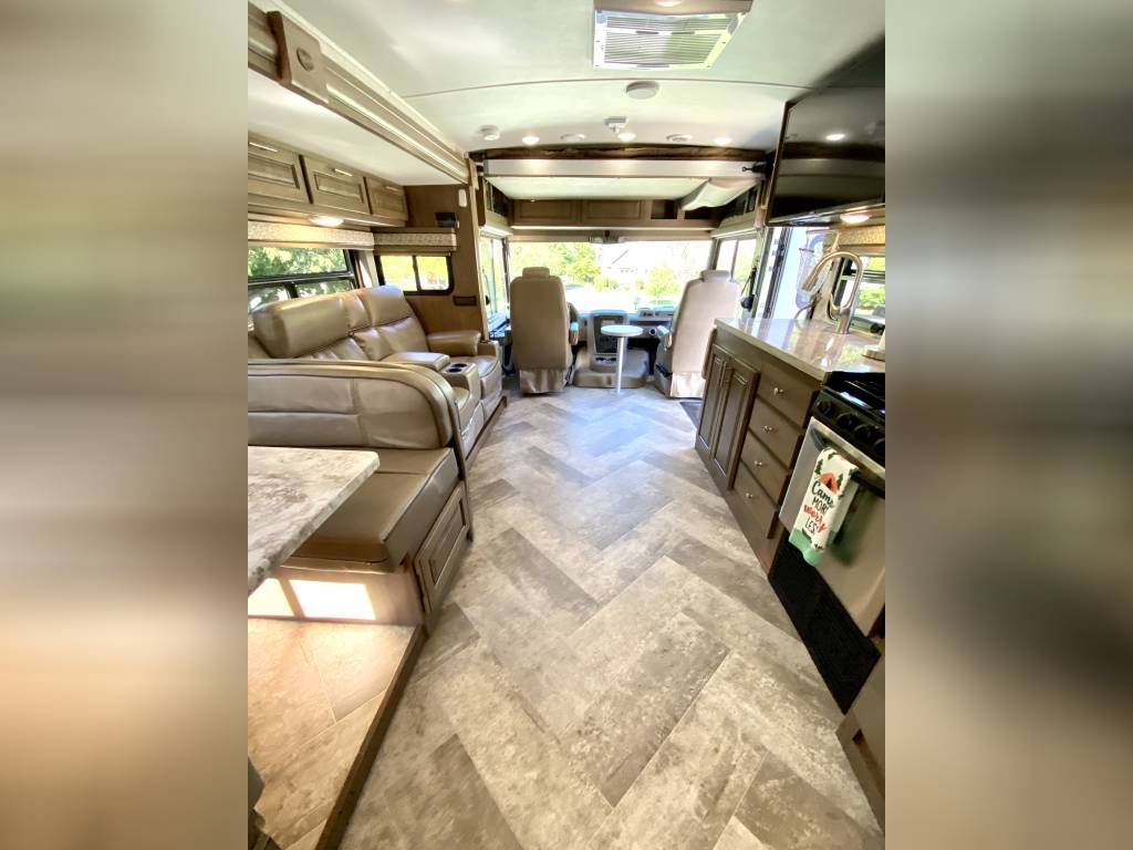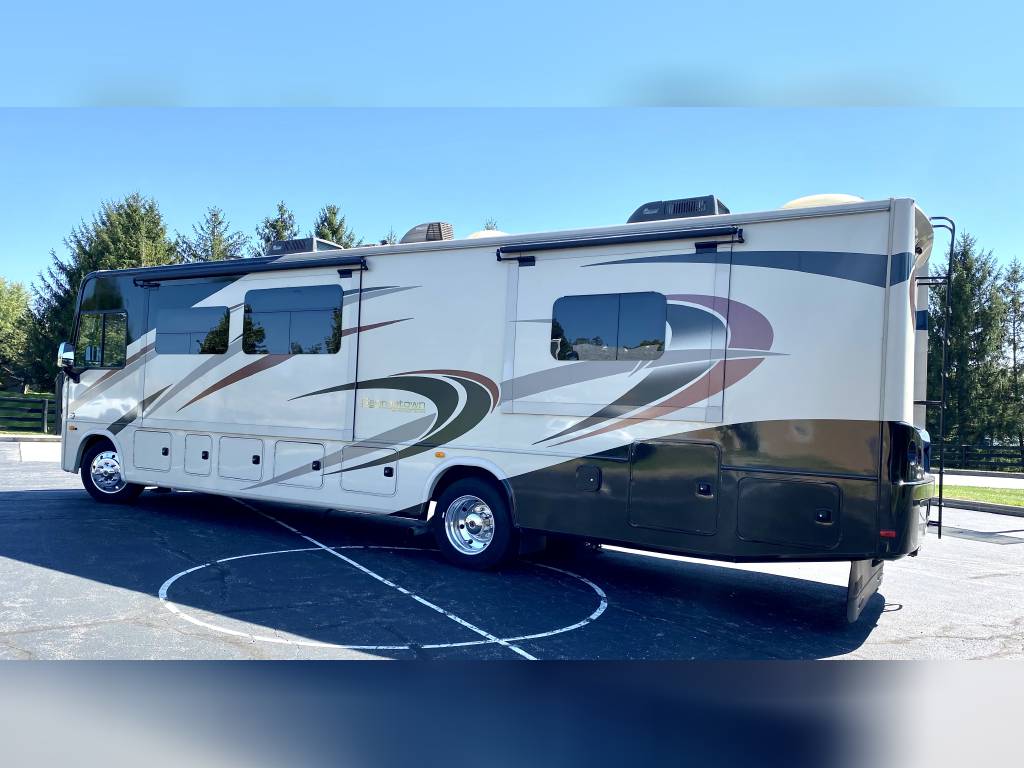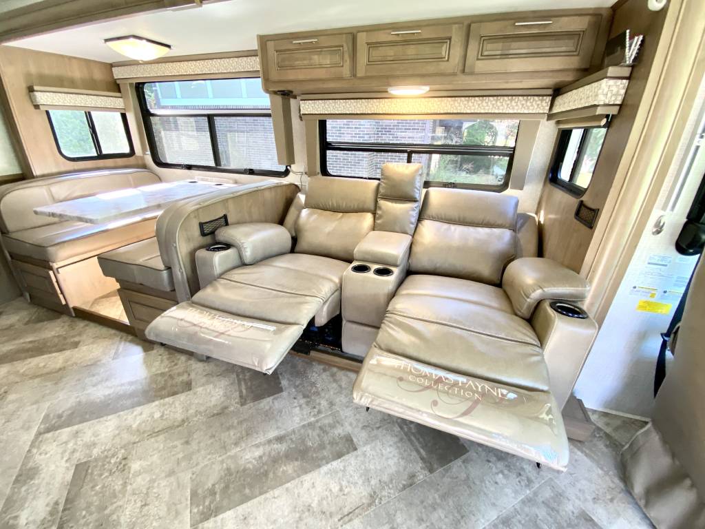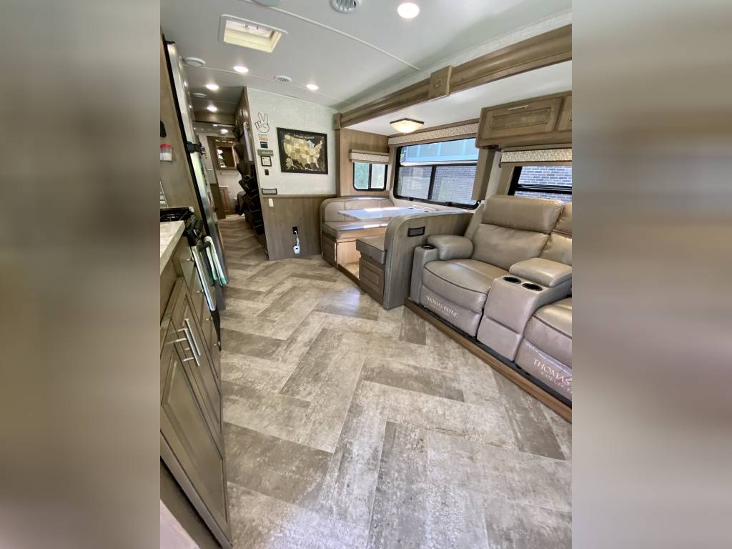 1 Owner Georgetown 36B5 Bunk House Class A with low miles (7,071). The Master Control Panel features MYRV Touch Screen w/Wireless Technology. 3 Slide Outs; 12.5 ft Power Retractable Awning w/LED Lighting; Hydraulic 4-Point Leveling Jacks; 1 Piece Fiberglass Roof; LED Accent Lights; Large Grey Rotocast Storage Compartments w/Drains – Some Lighted – 2 pass Thru; Rear Roof Ladder; Pioneer Dash Entertainment System w/AM/FM/Bluetooth/USB Surround Sound; Power Theater Seats w/Heat/Massage/Lighting/USB; 5000 lbs Tow Hitch w/7-Way Plug; Dual Coach Batteries; Electric Battery Disconnect; Color Side & Rear Camera; Hydraulic Disk Brakes; 55,000 BTUs Heater; 5 LED Flatscreen TV’s; King Jack Digital TV Antenna; Onan Generator; Power Front Sun Shade; Passenger Side Workstation; Two Ducted AC Roof Units; 2000 Watt Inverter System; Adjustable Rear-View Mirrors; Outside Shower; Outside Entertainment LED TV & Speakers; Locking Fuel Door. 2 Full Baths w/Fiberglass Showers & Glass Doors; Two 6 Gallon Water Heaters; Washer Dryer Combo Prep; Ample Storage. Master King Bed w/Touch Lighting; Loads of Storage and Closet Space in Master Bedroom including a Full Sliding Door; Bunkhouse equipped with TV’s, Lighting, and Privacy Shades; 39″x81″ Euro Loft Power Overhead Bunk features Lighting, Storage, and Privacy Curtain. Undermount Stainless Steel Kitchen Sink; Dream Dinette; 18ft Stainless Steel Residential Refrigerator/Freezer; Stainless Steel 3 Burner Cooktop w/Oven & Flush Mount Glass Stover Cover; Solid Surface Countertops; Flip-up Solid Surface Countertop Extension; Convection Microwave Oven. Add ons: Rock Guard; Manual disconnect to Chassis battery; Lend-A-Hand Exterior Railing; Two Maxxair Roof Covers; Winegard Connect 2.0. Unit has been recently serviced including fresh oil changes for both the engine and generator.