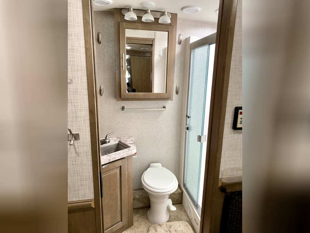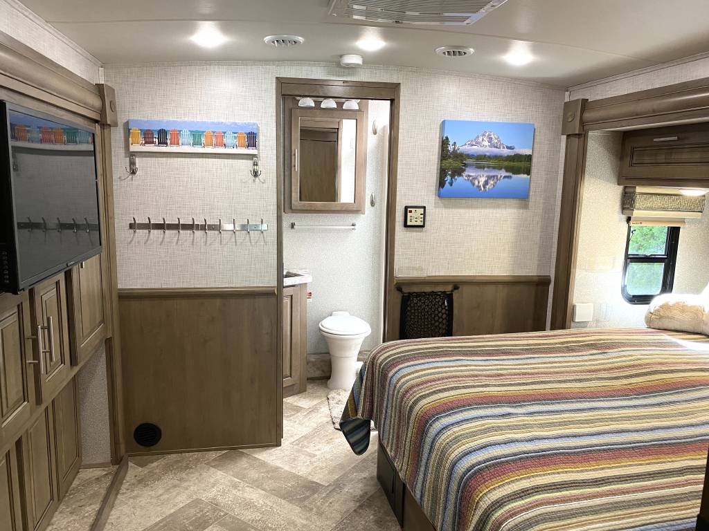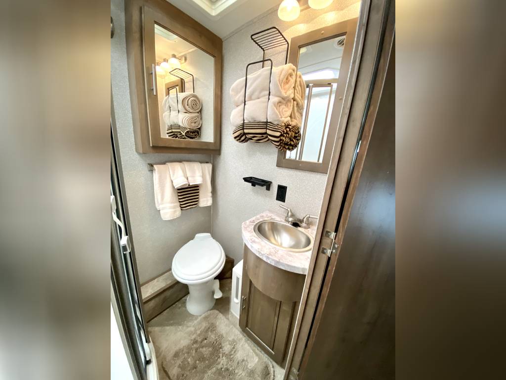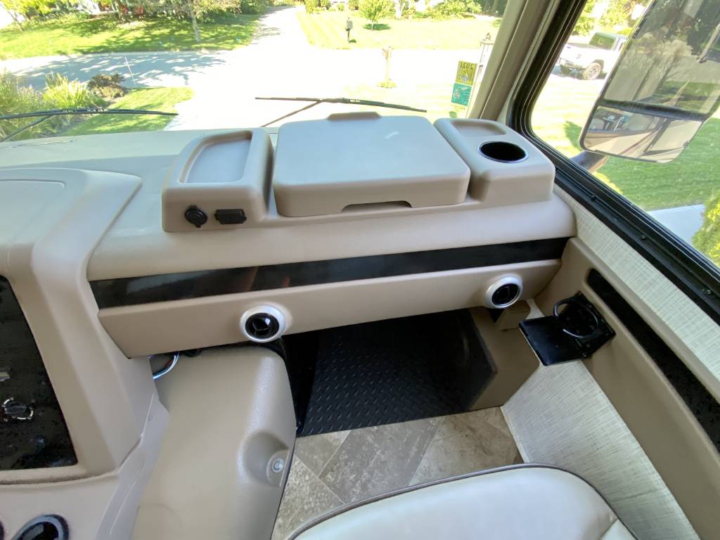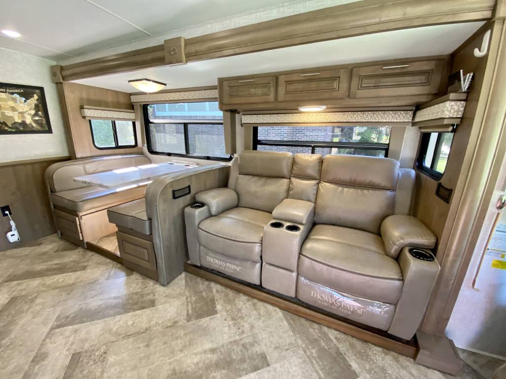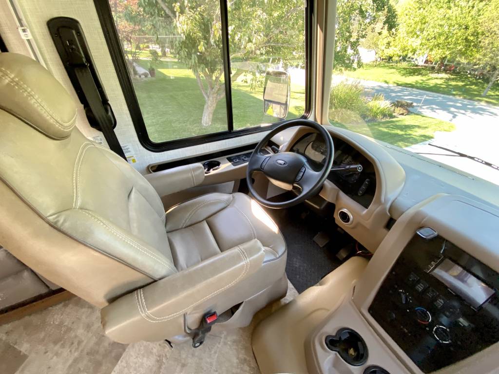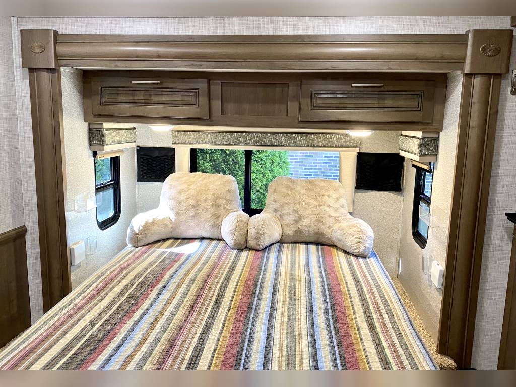 1 Owner Georgetown 36B5 Bunk House Class A with low miles (7,071). The Master Control Panel features MYRV Touch Screen w/Wireless Technology. 3 Slide Outs; 12.5 ft Power Retractable Awning w/LED Lighting; Hydraulic 4-Point Leveling Jacks; 1 Piece Fiberglass Roof; LED Accent Lights; Large Grey Rotocast Storage Compartments w/Drains – Some Lighted – 2 pass Thru; Rear Roof Ladder; Pioneer Dash Entertainment System w/AM/FM/Bluetooth/USB Surround Sound; Power Theater Seats w/Heat/Massage/Lighting/USB; 5000 lbs Tow Hitch w/7-Way Plug; Dual Coach Batteries; Electric Battery Disconnect; Color Side & Rear Camera; Hydraulic Disk Brakes; 55,000 BTUs Heater; 5 LED Flatscreen TV’s; King Jack Digital TV Antenna; Onan Generator; Power Front Sun Shade; Passenger Side Workstation; Two Ducted AC Roof Units; 2000 Watt Inverter System; Adjustable Rear-View Mirrors; Outside Shower; Outside Entertainment LED TV & Speakers; Locking Fuel Door. 2 Full Baths w/Fiberglass Showers & Glass Doors; Two 6 Gallon Water Heaters; Washer Dryer Combo Prep; Ample Storage. Master King Bed w/Touch Lighting; Loads of Storage and Closet Space in Master Bedroom including a Full Sliding Door; Bunkhouse equipped with TV’s, Lighting, and Privacy Shades; 39″x81″ Euro Loft Power Overhead Bunk features Lighting, Storage, and Privacy Curtain. Undermount Stainless Steel Kitchen Sink; Dream Dinette; 18ft Stainless Steel Residential Refrigerator/Freezer; Stainless Steel 3 Burner Cooktop w/Oven & Flush Mount Glass Stover Cover; Solid Surface Countertops; Flip-up Solid Surface Countertop Extension; Convection Microwave Oven. Add ons: Rock Guard; Manual disconnect to Chassis battery; Lend-A-Hand Exterior Railing; Two Maxxair Roof Covers; Winegard Connect 2.0. Unit has been recently serviced including fresh oil changes for both the engine and generator.