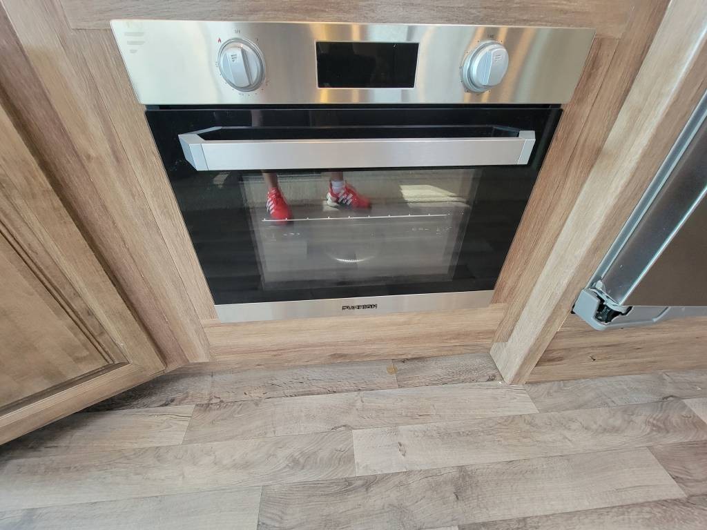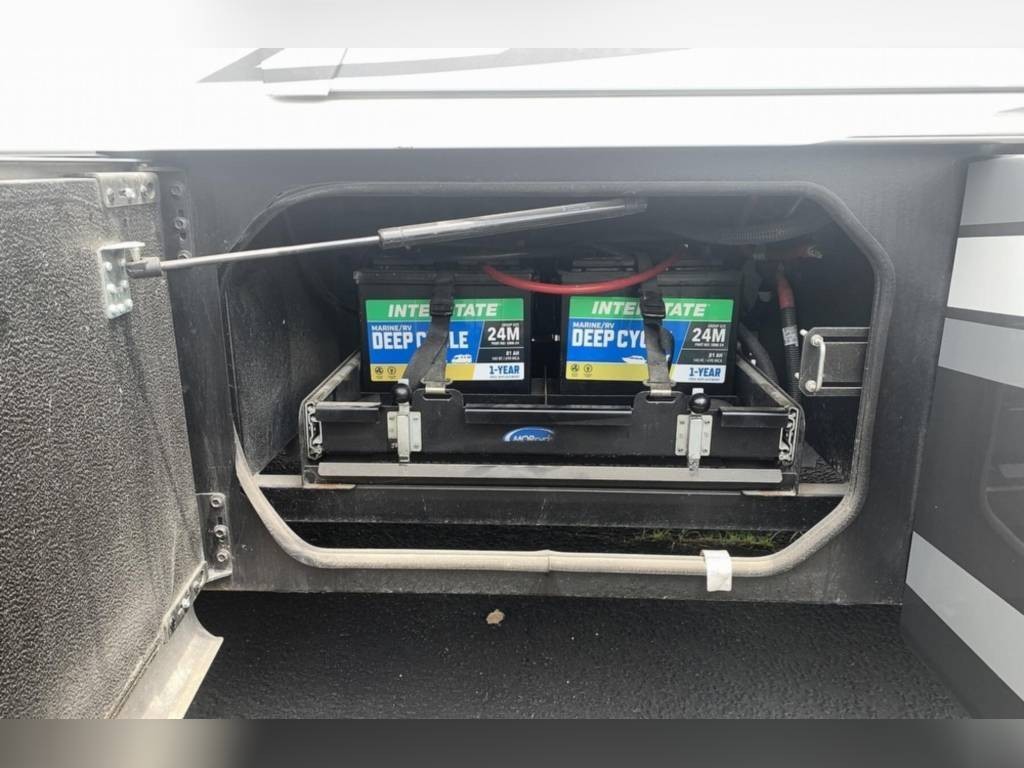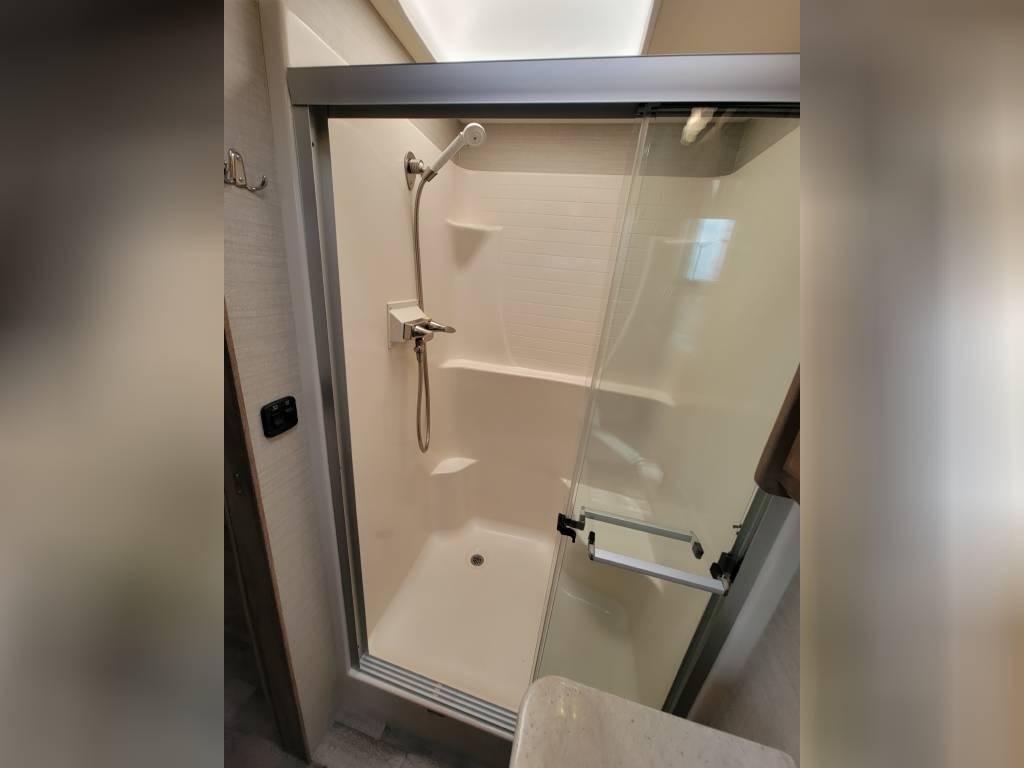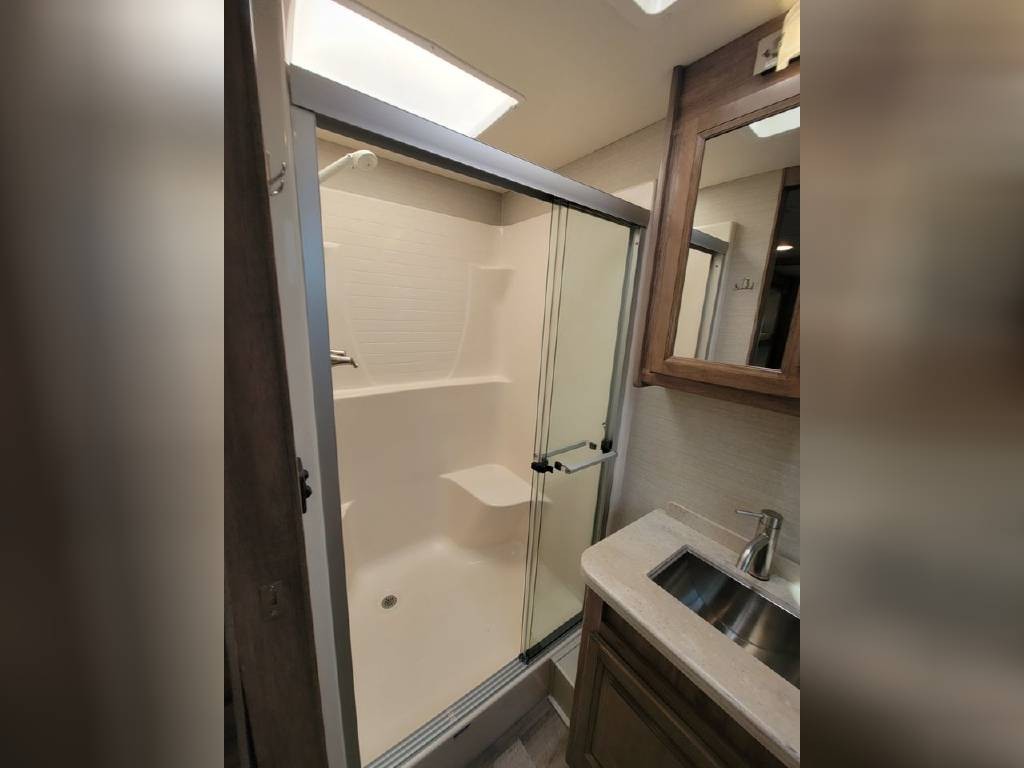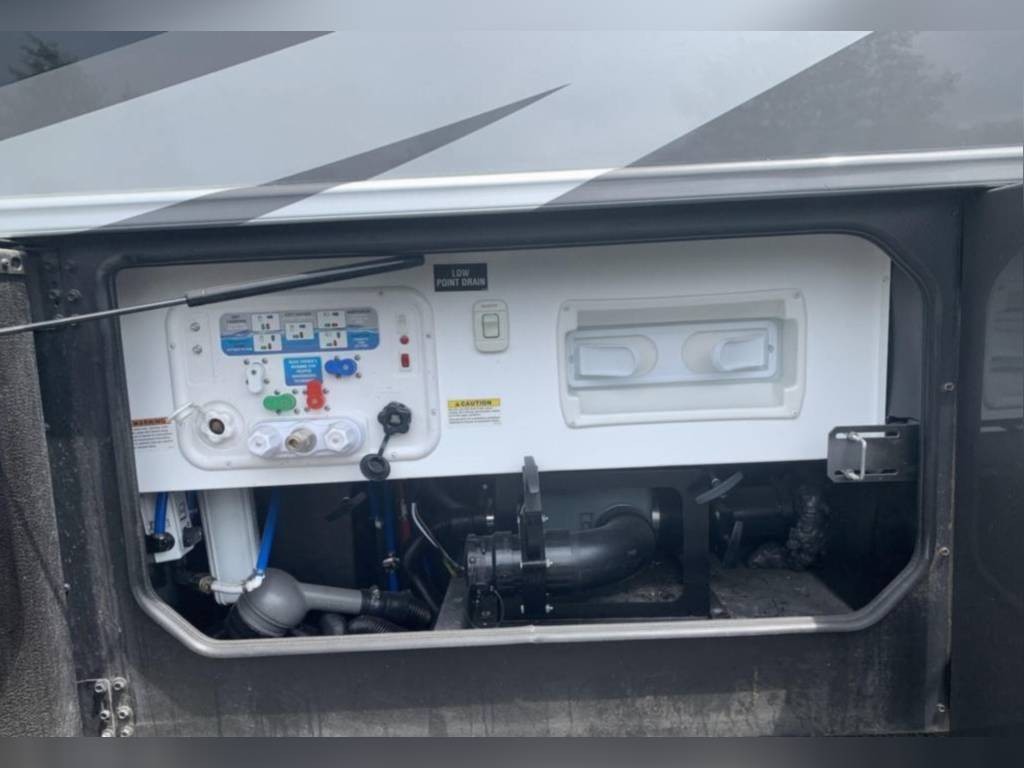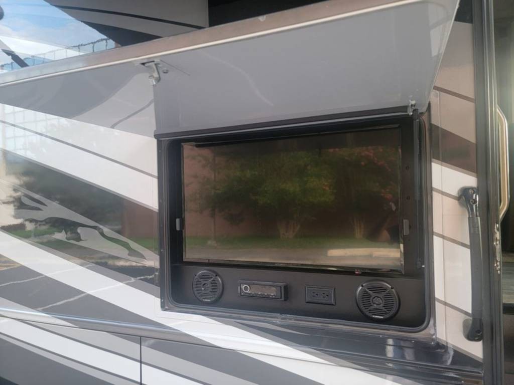 Great for entertaining everyone with a total of 5 televisions, two TV’s for each bunk bed, King master bedroom and main living area and an exterior entertainment center. This one comes with a bath and a half with a much desired large walk-in shower. The kitchen offers the comforts of home including an over sized full refrigerator and freezer that cools in an instant. It comes with gas oven and stove and double sink. Easy access slide out pantry with lots of elegant countertop space. Two AC units and Auto Level system! The fireplace makes an added bonus on cooler evenings. Lots of sleeping option with over the cab bed with ladder, dinette sleeper, King master and two bunk beds plenty of room for everyone. The spacious and well thought out Floorplan makes entertaining easy. This RV has only been used once! The previous owner ran it into a fence and caused cosmetic damage to the front cab and windshield.