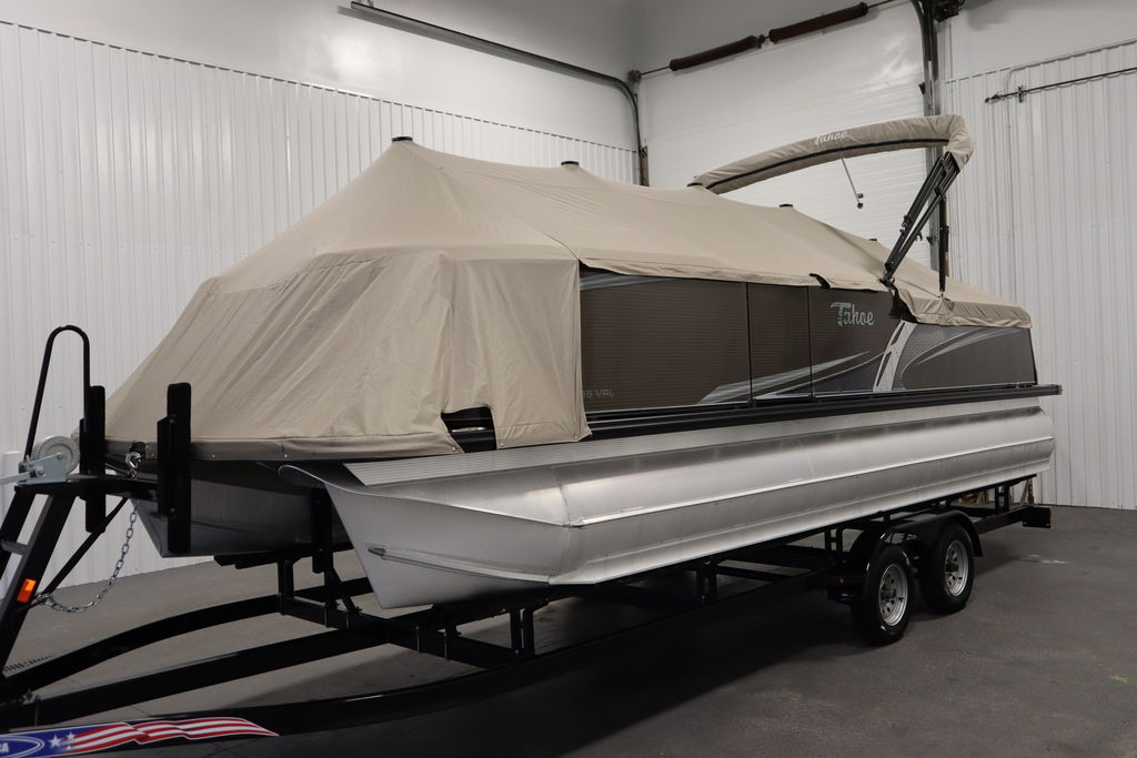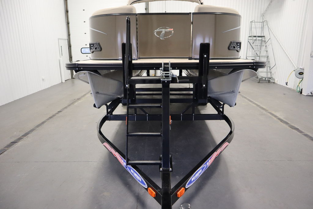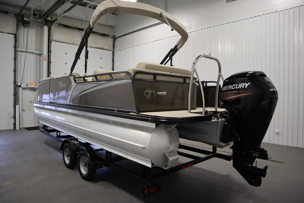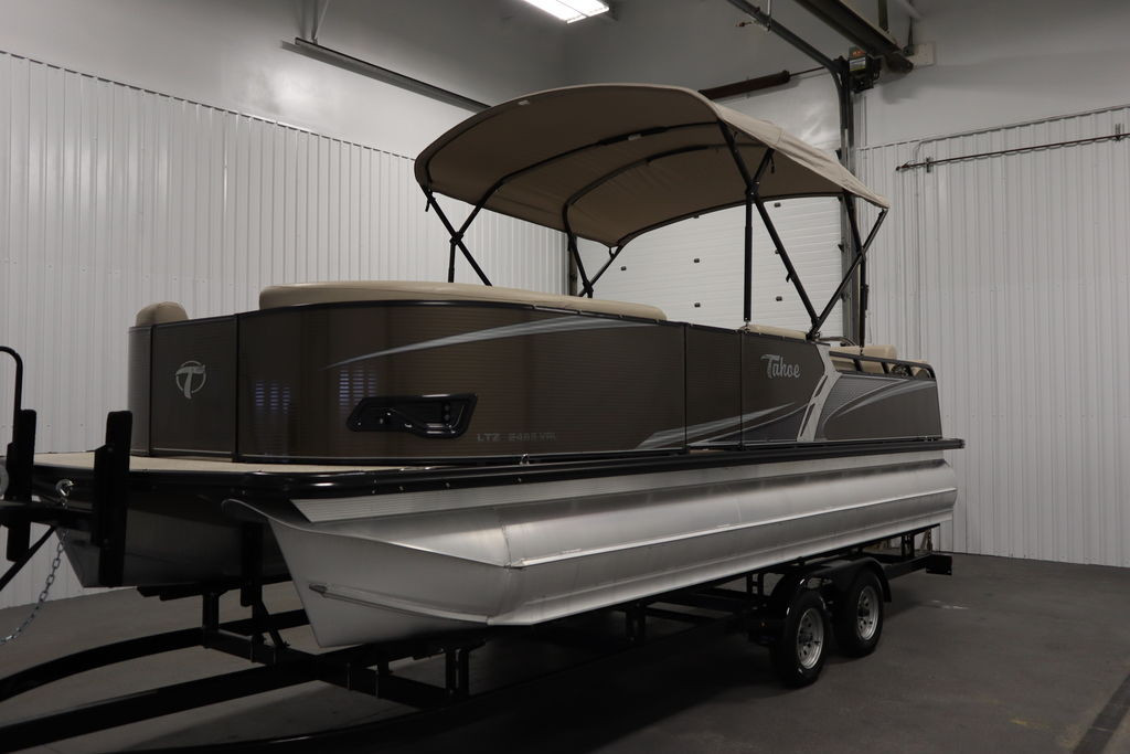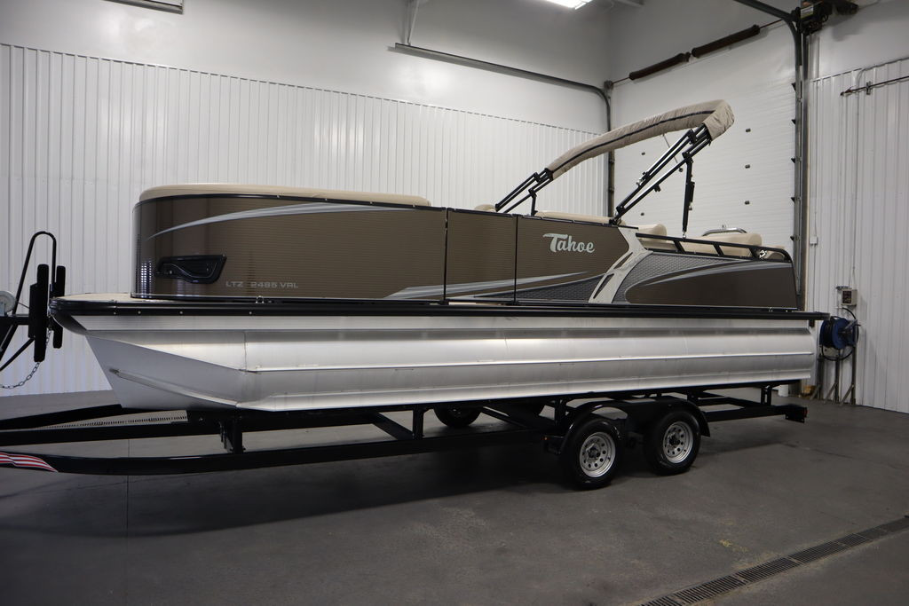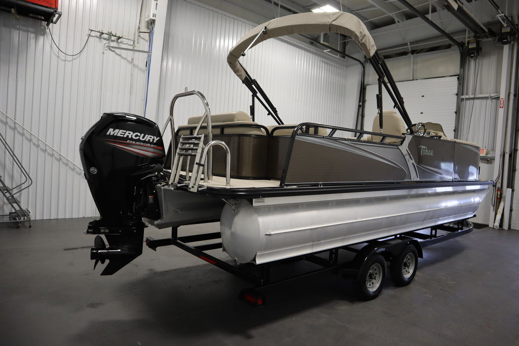 CLEAN 2019 TAHOE LTZ 2485 VRL PONTOON WITH TRAILER AND ONLY 29 ENGINE HOURS! A 115 hp Mercury Command Thrust 4-stroke EFI outboard powers this nicely equipped package.