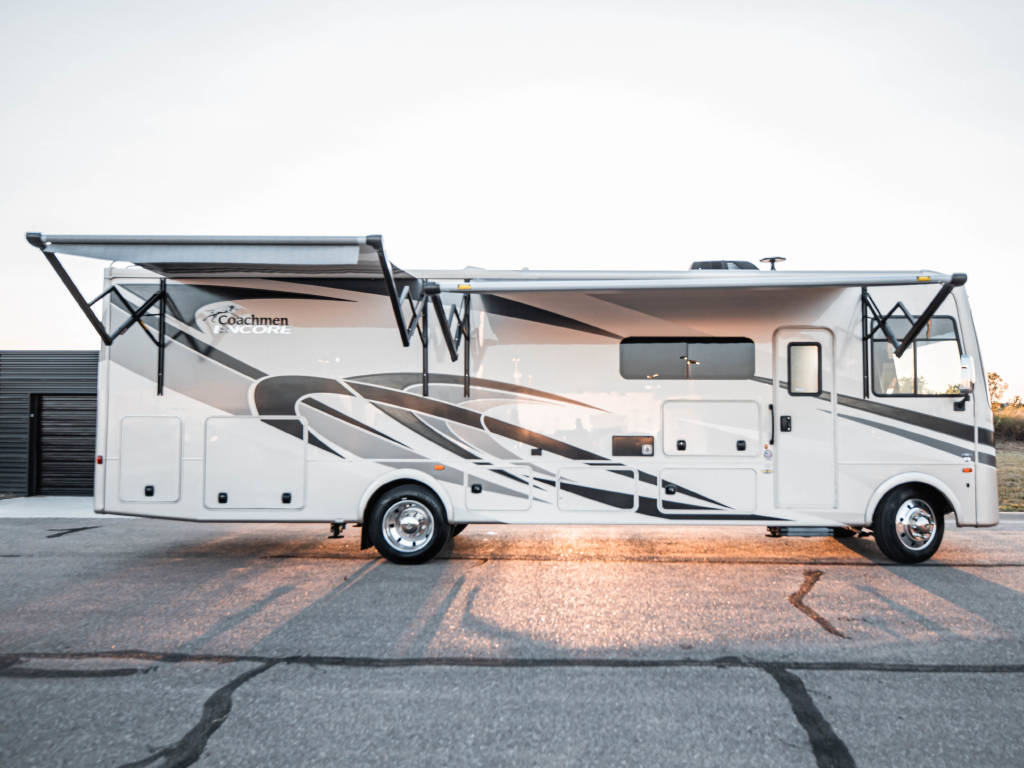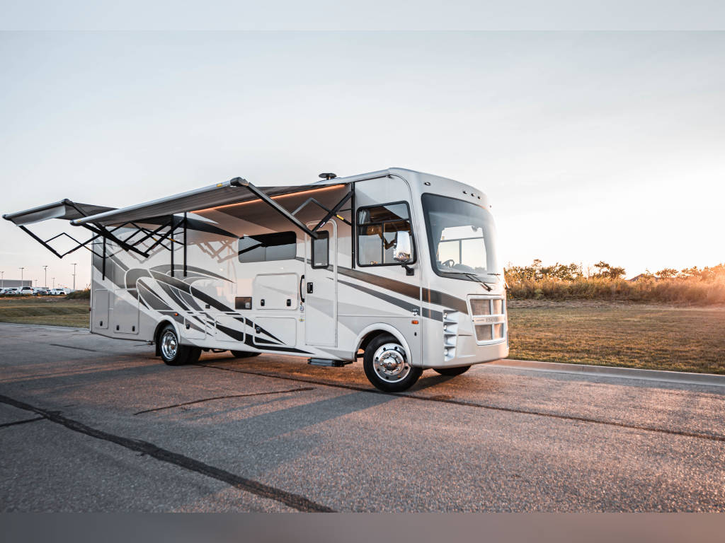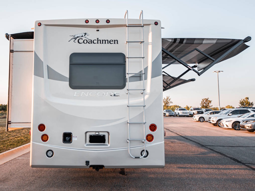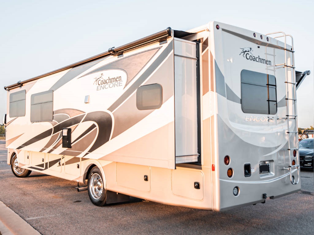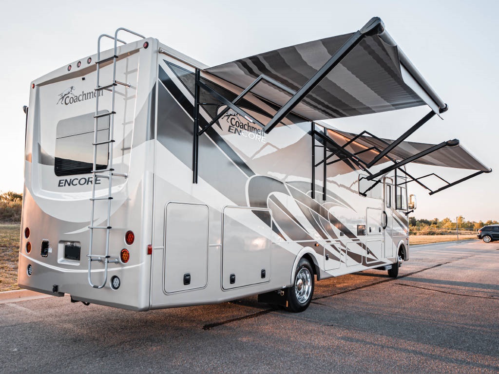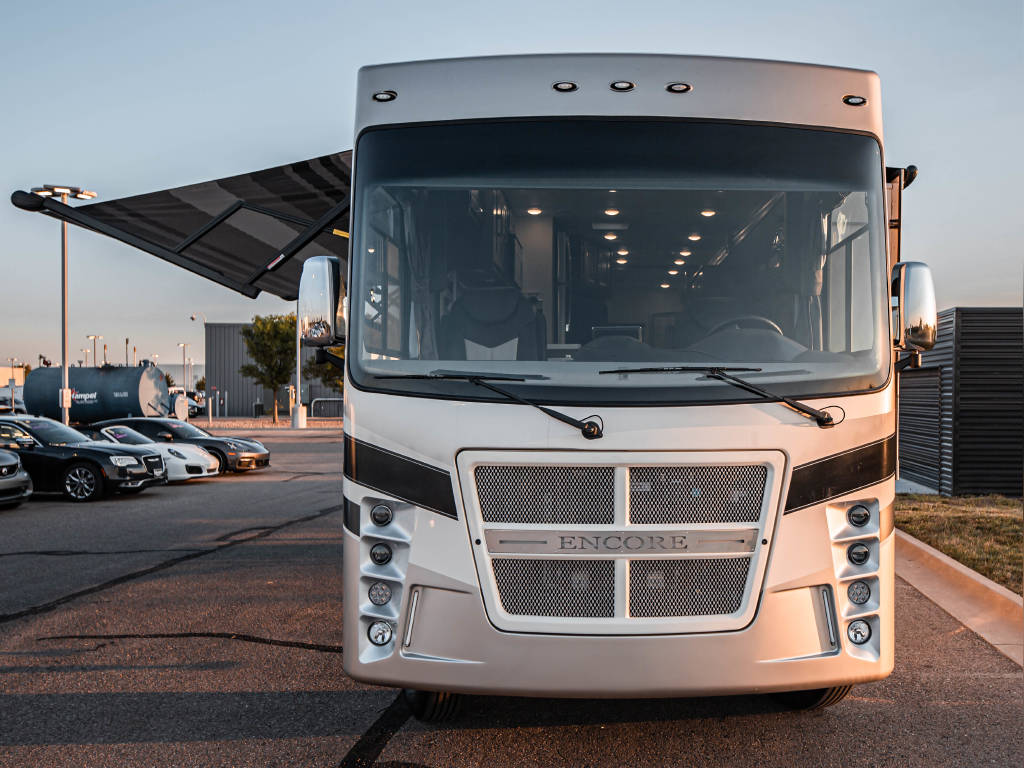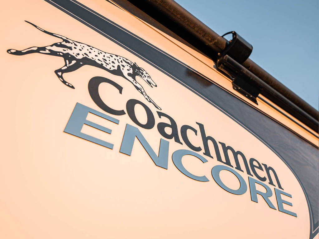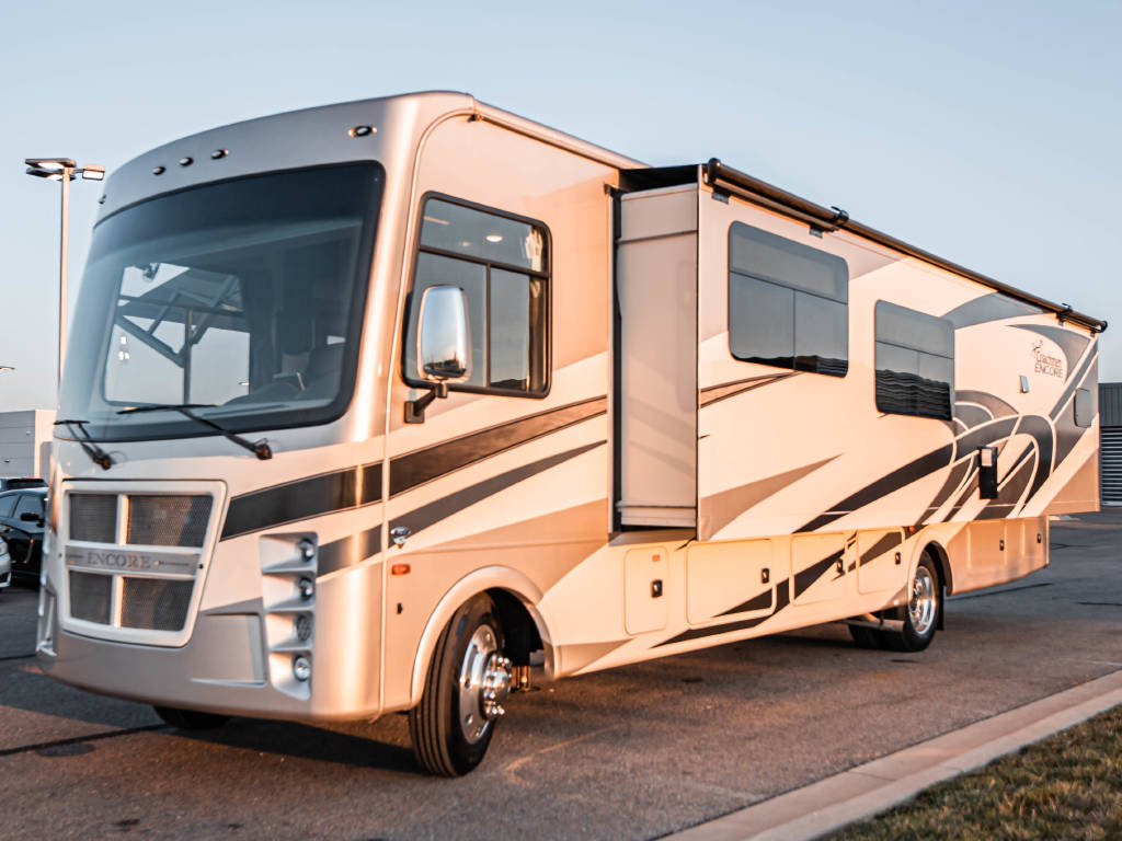 One-owner 2021 Coachman Encore ERA325SSF! This Class A beauty is paired with a Ford F53 Chassis and the 7.3L V8 Godzilla Gas engine with 350 HP and 468 lb ft. of torque. This RV has high definition back up and side cameras, automatic leveling jacks, outdoor kitchen with sink & mini fridge, exterior TV with Bluetooth Audio Speakers in the awning, roof-mounted 100-watt solar panel, frameless tinted windows, exterior heated bus mirrors, 20% angled dash, 40″ LED living room TV, fiberglass front and rear caps, ***1-piece laminated pebbled fiberglass roof with AZDEL composite (walkable)***, electric 5,000 BTU fireplace, stackable washer and dryer, ***Safe T Plus Front Stabilizer***.