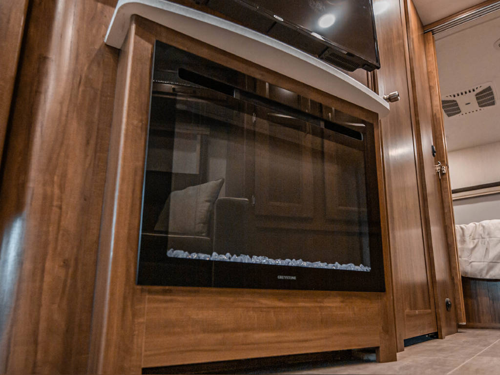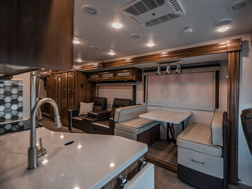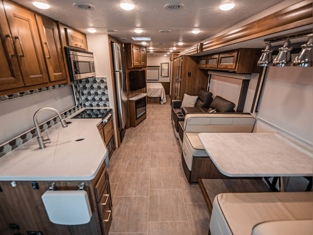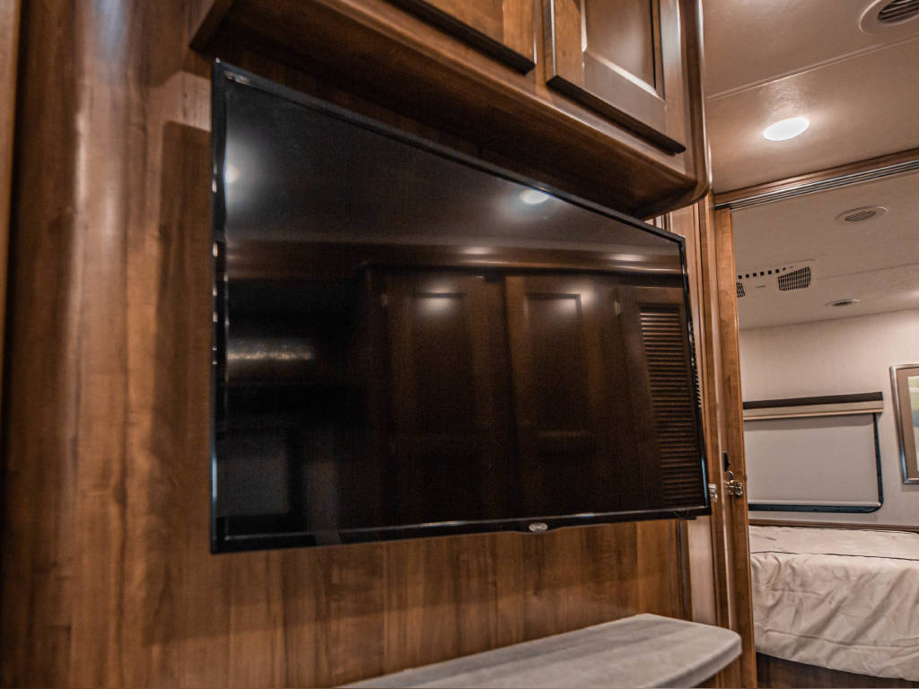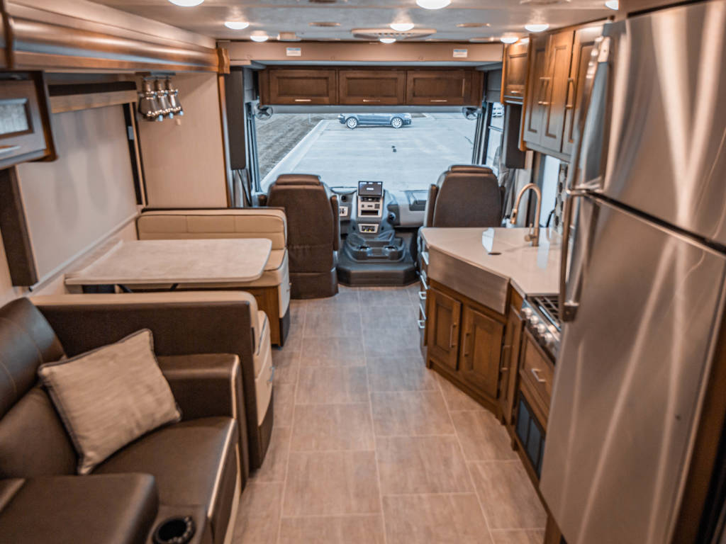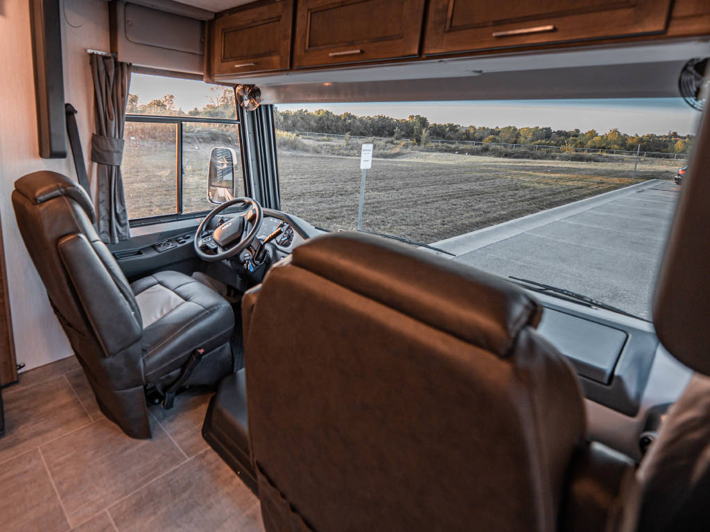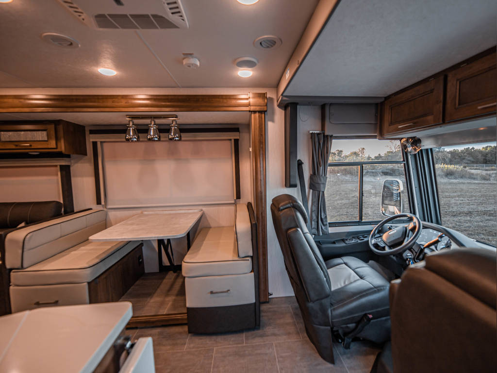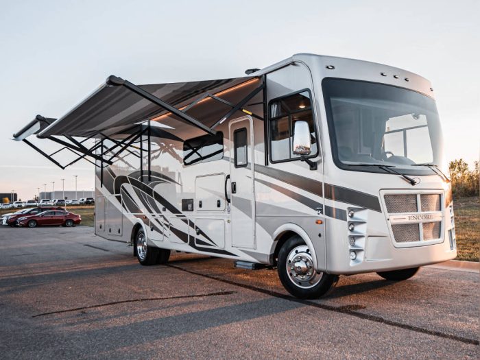 One-owner 2021 Coachman Encore ERA325SSF! This Class A beauty is paired with a Ford F53 Chassis and the 7.3L V8 Godzilla Gas engine with 350 HP and 468 lb ft. of torque. This RV has high definition back up and side cameras, automatic leveling jacks, outdoor kitchen with sink & mini fridge, exterior TV with Bluetooth Audio Speakers in the awning, roof-mounted 100-watt solar panel, frameless tinted windows, exterior heated bus mirrors, 20% angled dash, 40″ LED living room TV, fiberglass front and rear caps, ***1-piece laminated pebbled fiberglass roof with AZDEL composite (walkable)***, electric 5,000 BTU fireplace, stackable washer and dryer, ***Safe T Plus Front Stabilizer***.