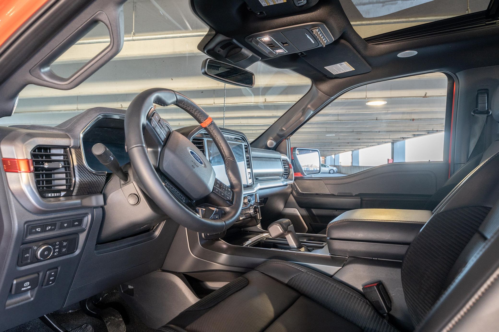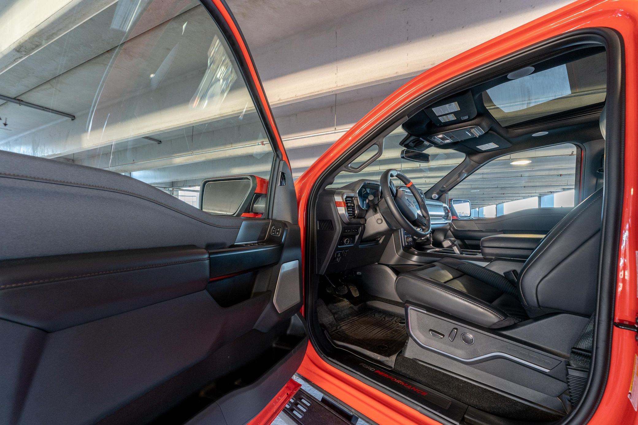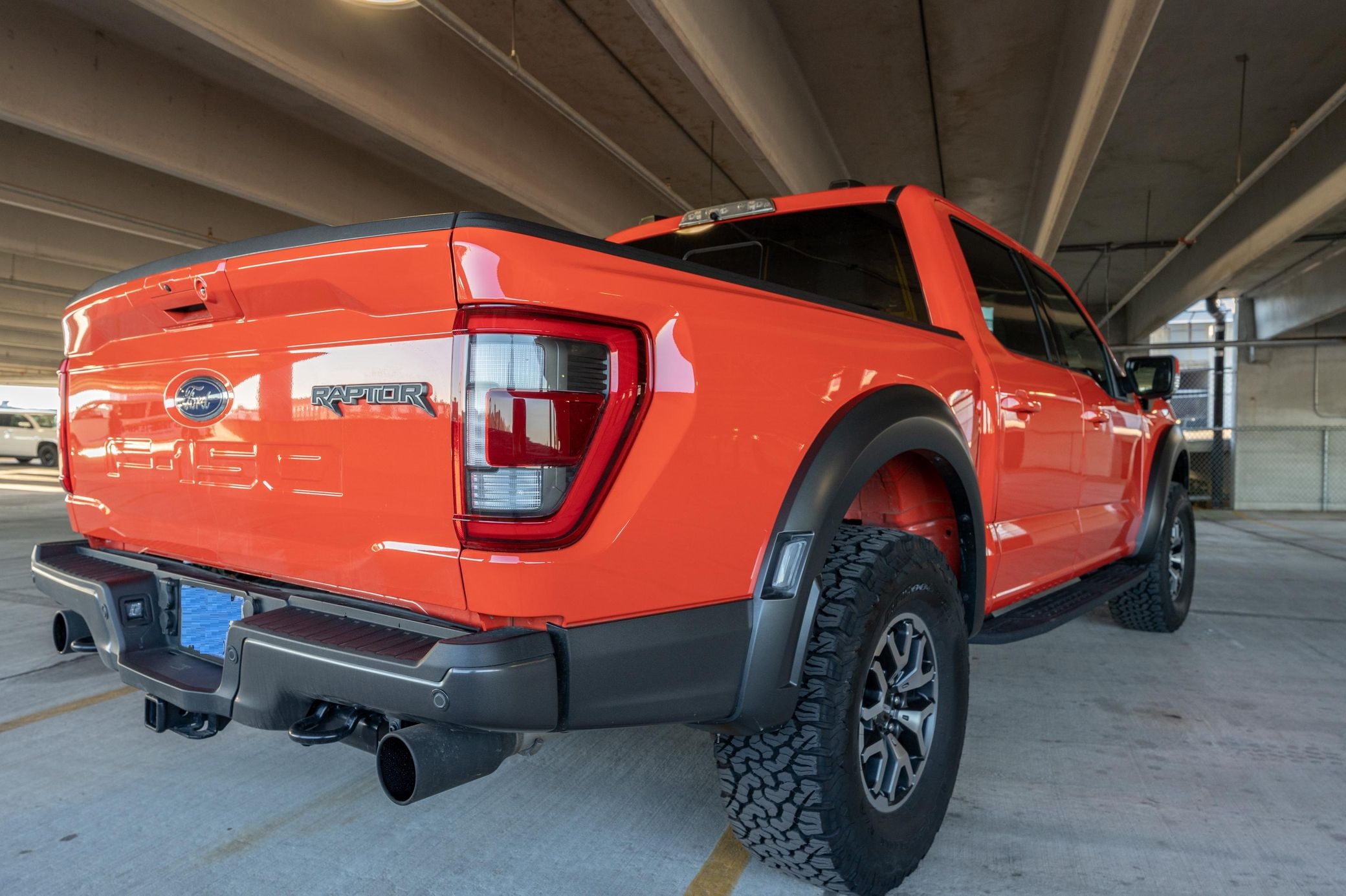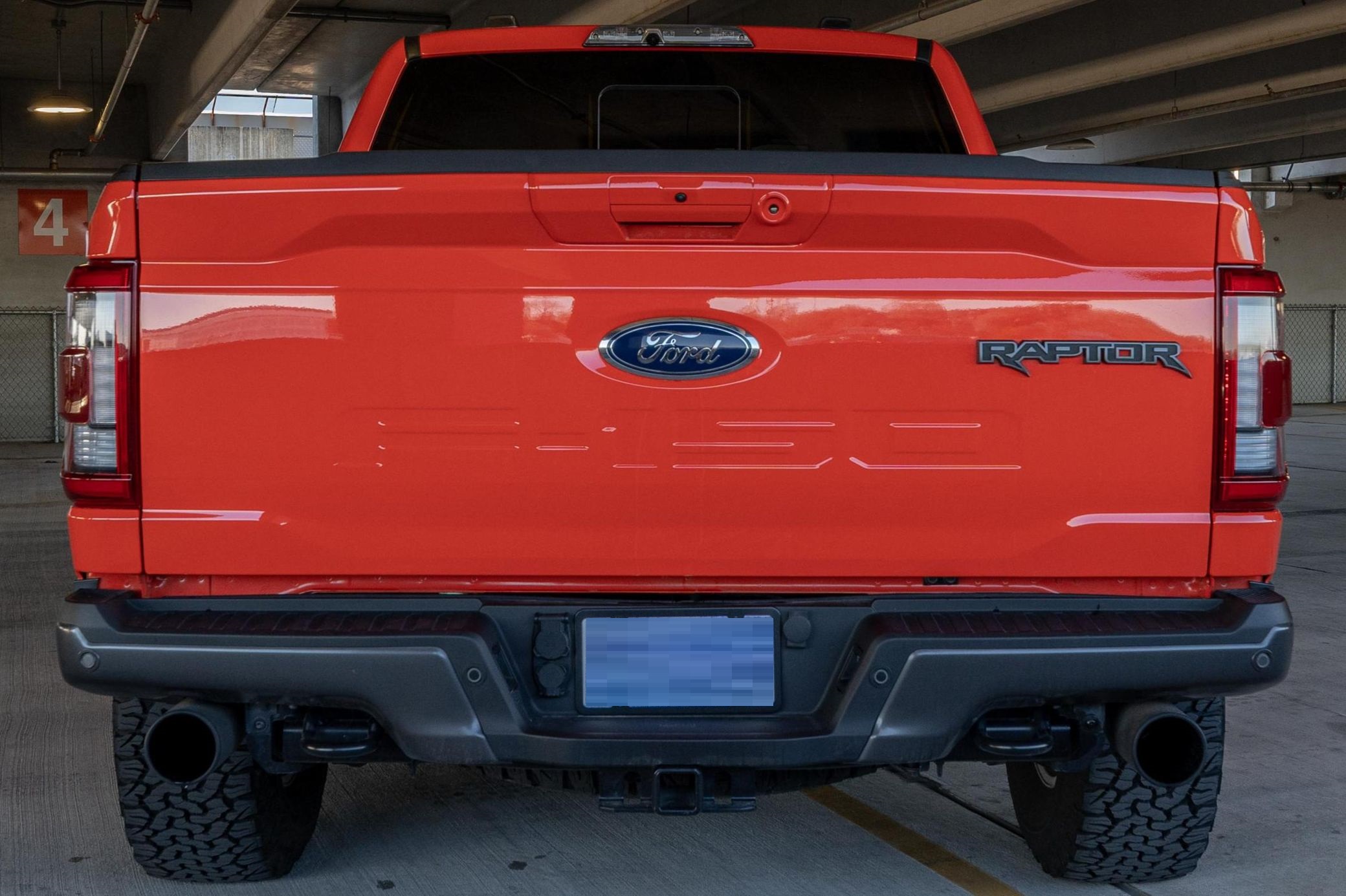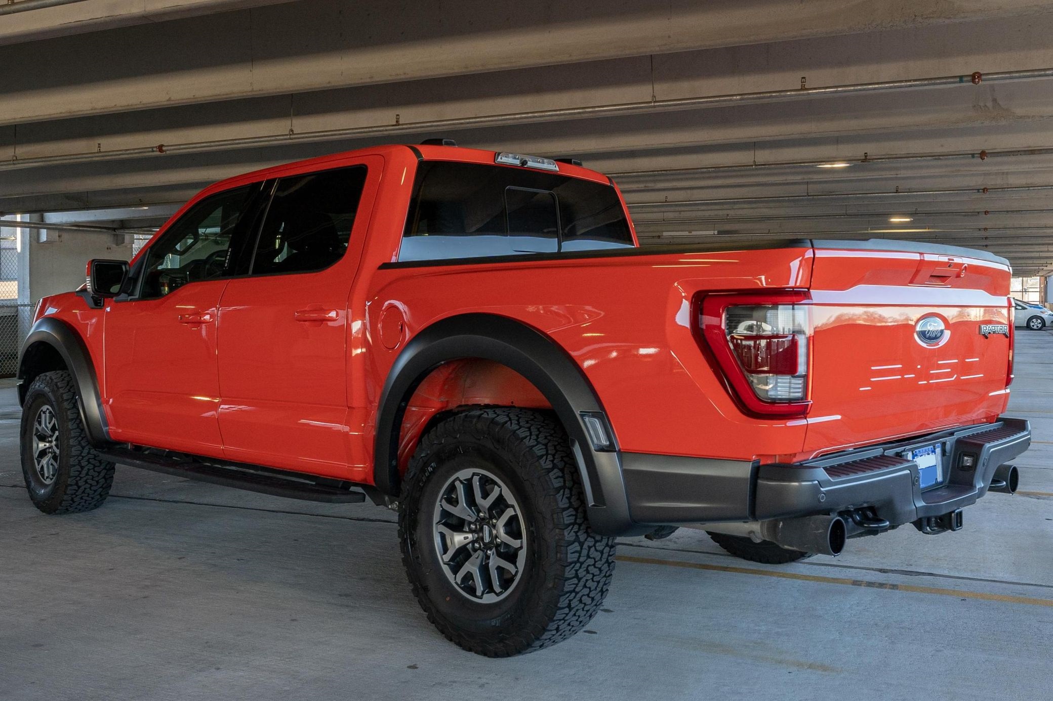 THIS… is a 2021 Ford F-150 Raptor, finished in Code Orange Metallic with a black interior. The attached Carfax history report lists no accidents or damage in this truck’s past. Factory equipment includes the Power Tech and Raptor Carbon packages, an 18-speaker Bang & Olufsen audio system, 17-inch wheels, a Raptor-specific off-road suspension system, skid plates, running boards, a trailer hitch, heated and ventilated front seats, a 360-degree camera system, and rear parking sensors. Modifications reported by the seller are limited to Decked bed drawers and Line-X spray-in bed liner. Designed to speed across the desert Baja racing-style, the third-generation F-150 Raptor made its debut for the 2021 model year. In addition to styling changes, Ford upgraded the rear suspension to a coil-spring setup to replace the old leaf springs. Additionally, the new Raptor gets a fully digital instrument cluster, a 12-inch touchscreen infotainment system, and a shift lever that folds flat into the center console area. Power for this Raptor comes from a turbocharged 3.5-liter “EcoBoost” V6, which produces 450 horsepower and 510 lb-ft of torque. The engine spins the 4 wheels via a 10-speed automatic transmission linked to a pair of shift paddles and a 2-speed transfer case.