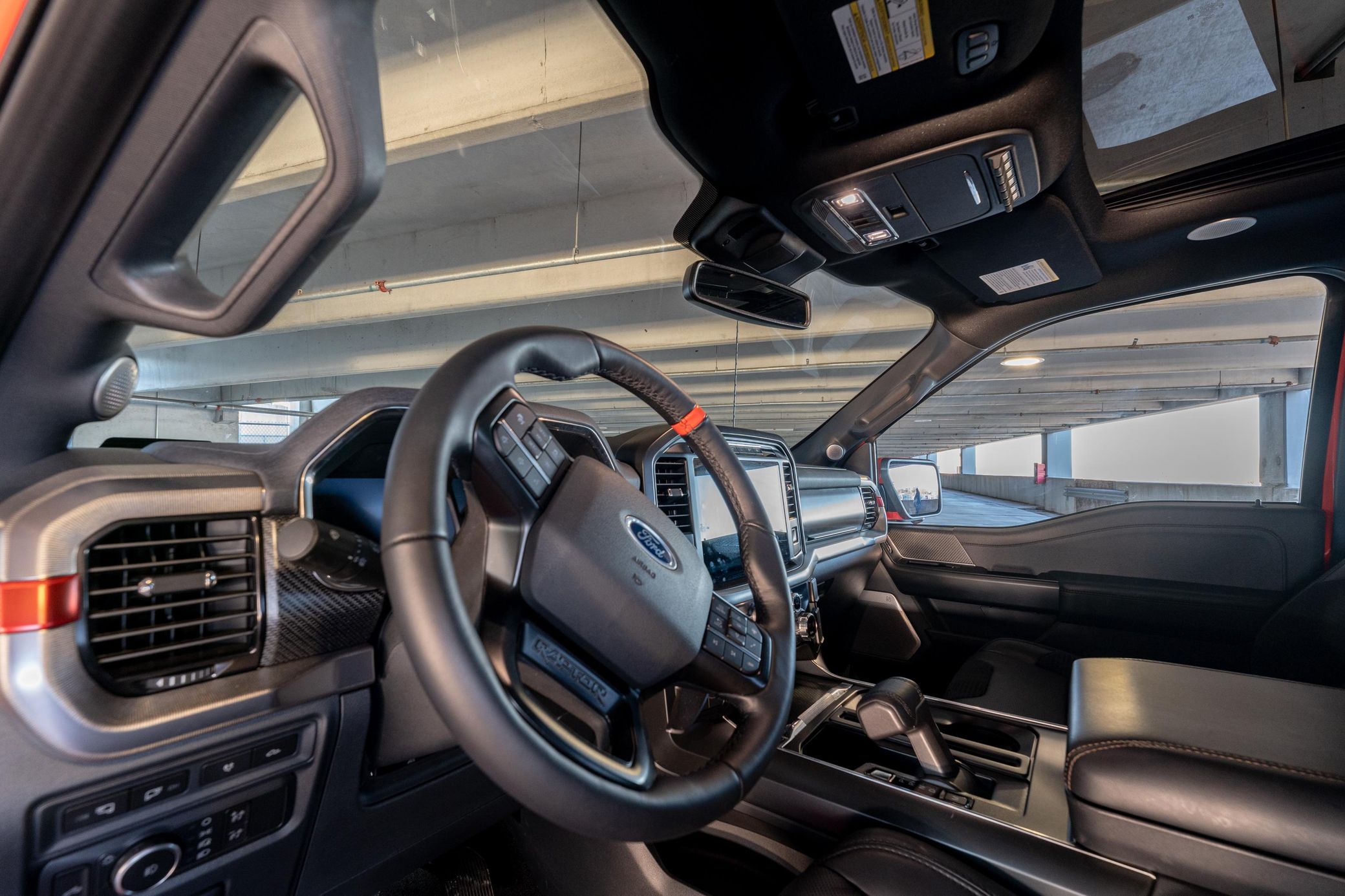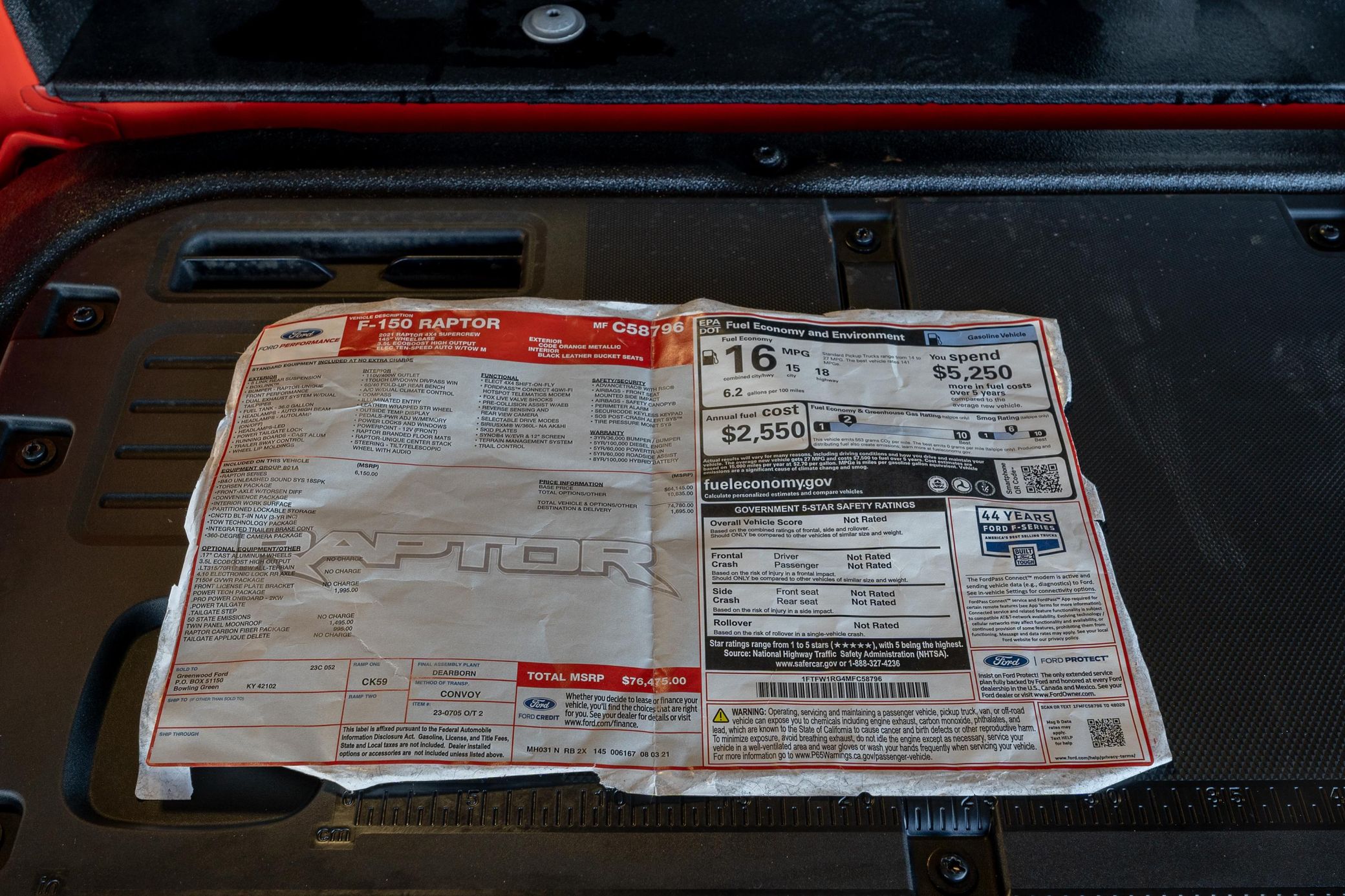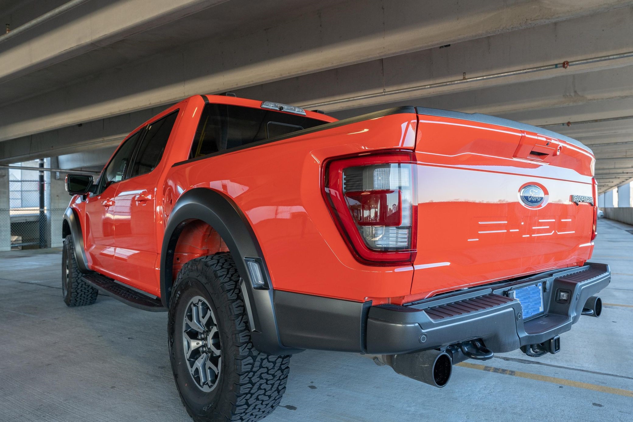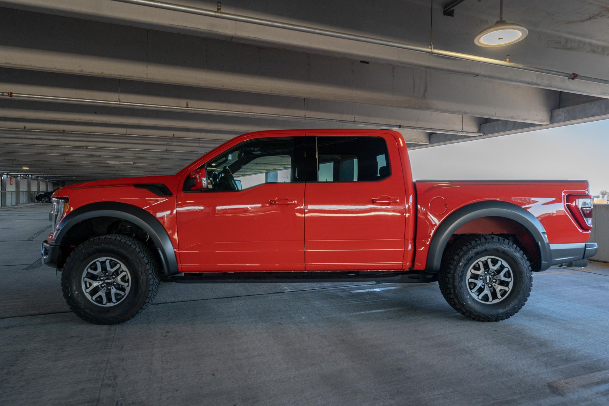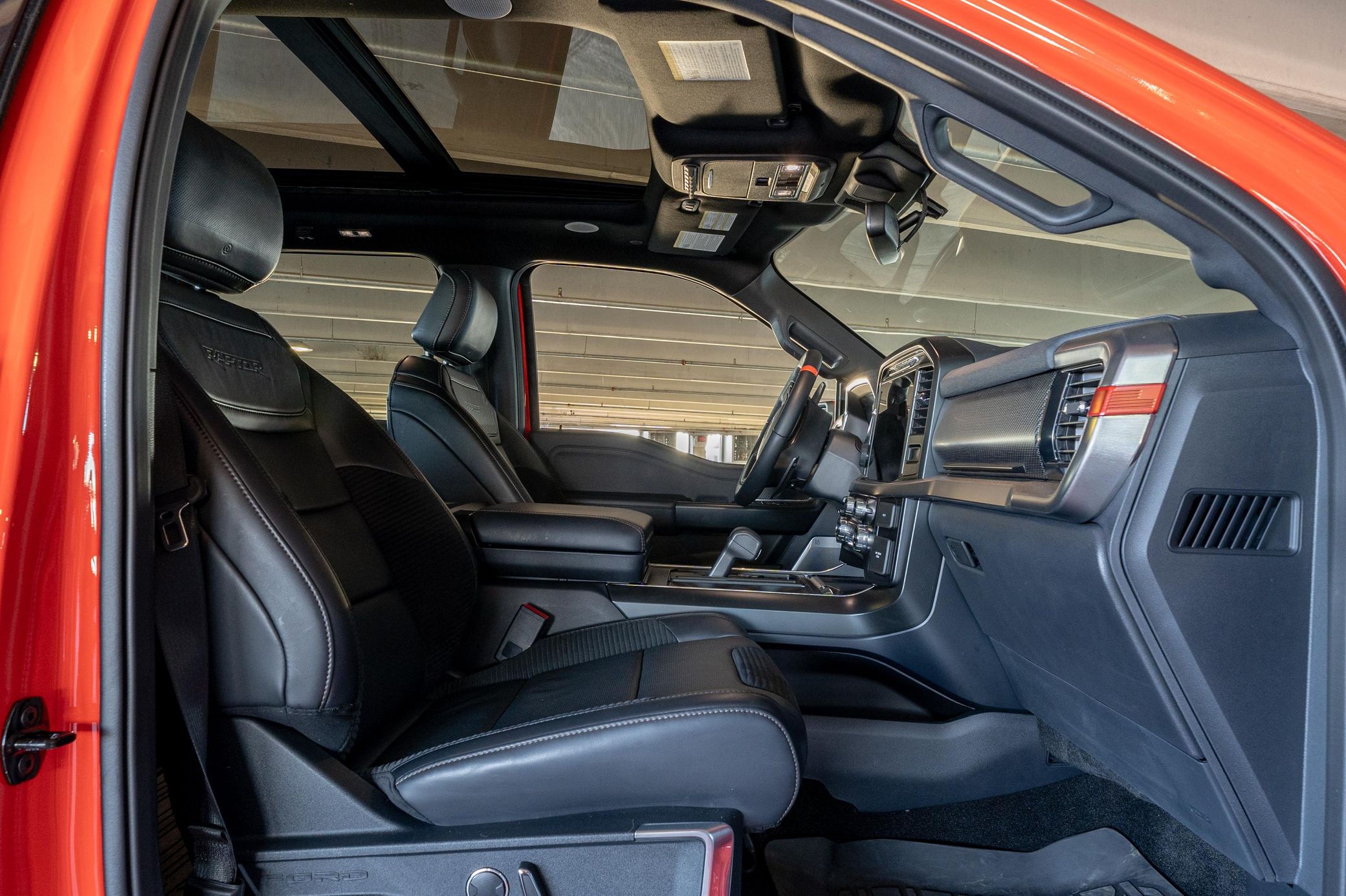 THIS… is a 2021 Ford F-150 Raptor, finished in Code Orange Metallic with a black interior. The attached Carfax history report lists no accidents or damage in this truck’s past. Factory equipment includes the Power Tech and Raptor Carbon packages, an 18-speaker Bang & Olufsen audio system, 17-inch wheels, a Raptor-specific off-road suspension system, skid plates, running boards, a trailer hitch, heated and ventilated front seats, a 360-degree camera system, and rear parking sensors. Modifications reported by the seller are limited to Decked bed drawers and Line-X spray-in bed liner. Designed to speed across the desert Baja racing-style, the third-generation F-150 Raptor made its debut for the 2021 model year. In addition to styling changes, Ford upgraded the rear suspension to a coil-spring setup to replace the old leaf springs. Additionally, the new Raptor gets a fully digital instrument cluster, a 12-inch touchscreen infotainment system, and a shift lever that folds flat into the center console area. Power for this Raptor comes from a turbocharged 3.5-liter “EcoBoost” V6, which produces 450 horsepower and 510 lb-ft of torque. The engine spins the 4 wheels via a 10-speed automatic transmission linked to a pair of shift paddles and a 2-speed transfer case.